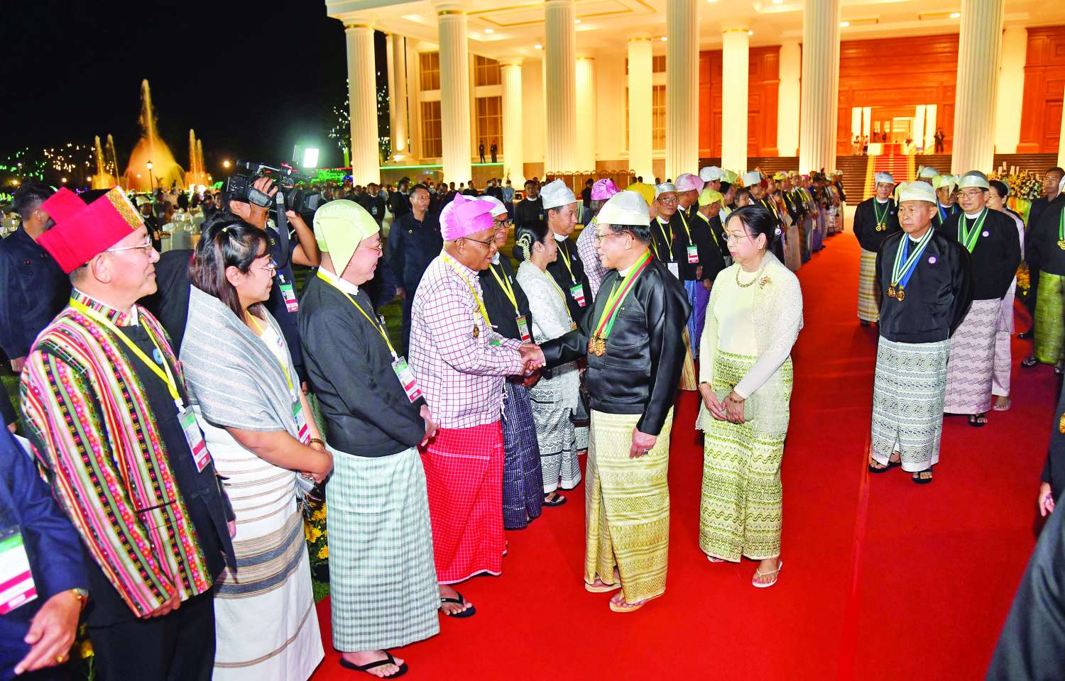 ထို့နောက် နိုင်ငံတော်ယာယီသမ္မတ နိုင်ငံတော်လုံခြုံရေးနှင့်အေးချမ်းသာယာရေးကော်မရှင်ဥက္ကဋ္ဌ ဗိုလ်ချုပ်မှူးကြီး သတိုးမဟာသရေစည်သူ သတိုးသီရိသုဓမ္မ မင်းအောင်လှိုင်နှင့် ဇနီးဒေါ်ကြူကြူလှတို့သည် ဂုဏ်ပြုဆောင်ခန်းမ ဥပစာမြက်ခင်းပြင်သို့ရောက်ရှိကြပြီး နိုင်ငံတော်လုံခြုံရေးနှင့်အေးချမ်းသာယာရေးကော်မရှင်ဥက္ကဋ္ဌနှင့်ဇနီးတို့နှင့်အတူ ဂုဏ်ပြုညစာစားပွဲအခမ်းအနားသို့ တက်ရောက်လာကြသည့် နိုင်ငံရေးပါတီများမှဥက္ကဋ္ဌများနှင့် ကိုယ်စားလှယ်များ၊ နိုင်ငံခြားသံရုံးများမှ သံအမတ်ကြီးများနှင့် သံရုံးတာဝန်ခံများ၊ ဂုဏ်ထူးဆောင်ကောင်စစ်ဝန်များနှင့် အထူးဖိတ်ကြားထားသည့် ဧည့်သည်တော်များကို ရင်းရင်းနှီးနှီး နှုတ်ဆက်သည်။