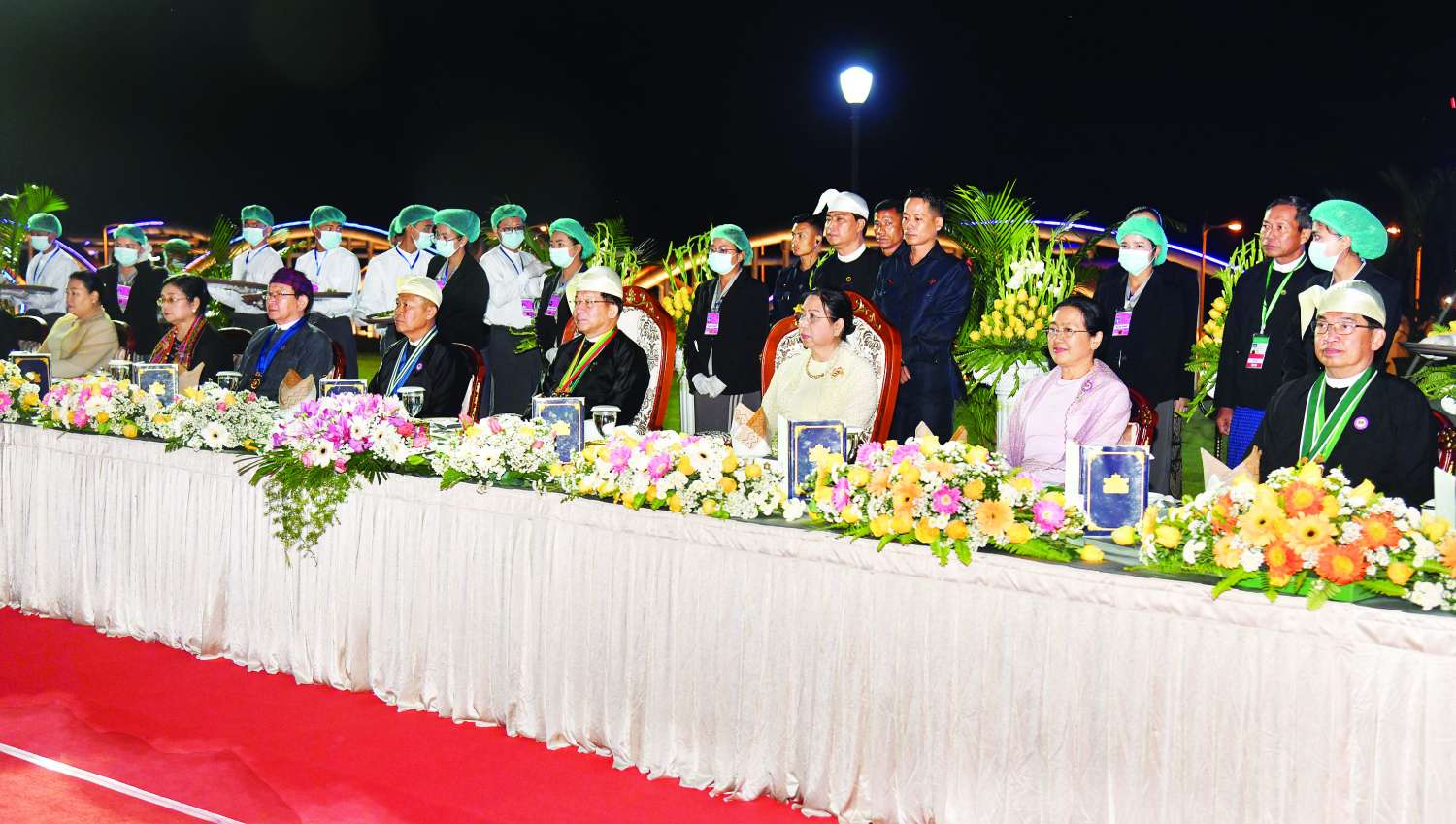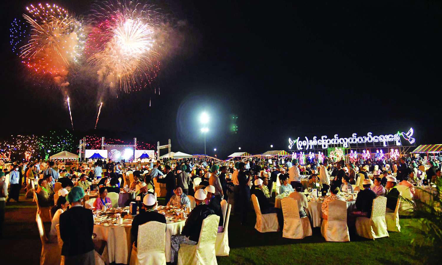 ယင်းနောက် နိုင်ငံတော်ယာယီသမ္မတ နိုင်ငံတော်လုံခြုံရေးနှင့် အေးချမ်းသာယာရေးကော်မရှင်ဥက္ကဋ္ဌနှင့် ဇနီးတို့သည် ဂုဏ်ပြုညစာစားပွဲအခမ်းအနားသို့ တက်ရောက်လာကြသူများနှင့်အတူ မီးရှူးမီးပန်းများပစ်ဖောက်မှုကို ကြည့်ရှုအားပေးကြသည်။
