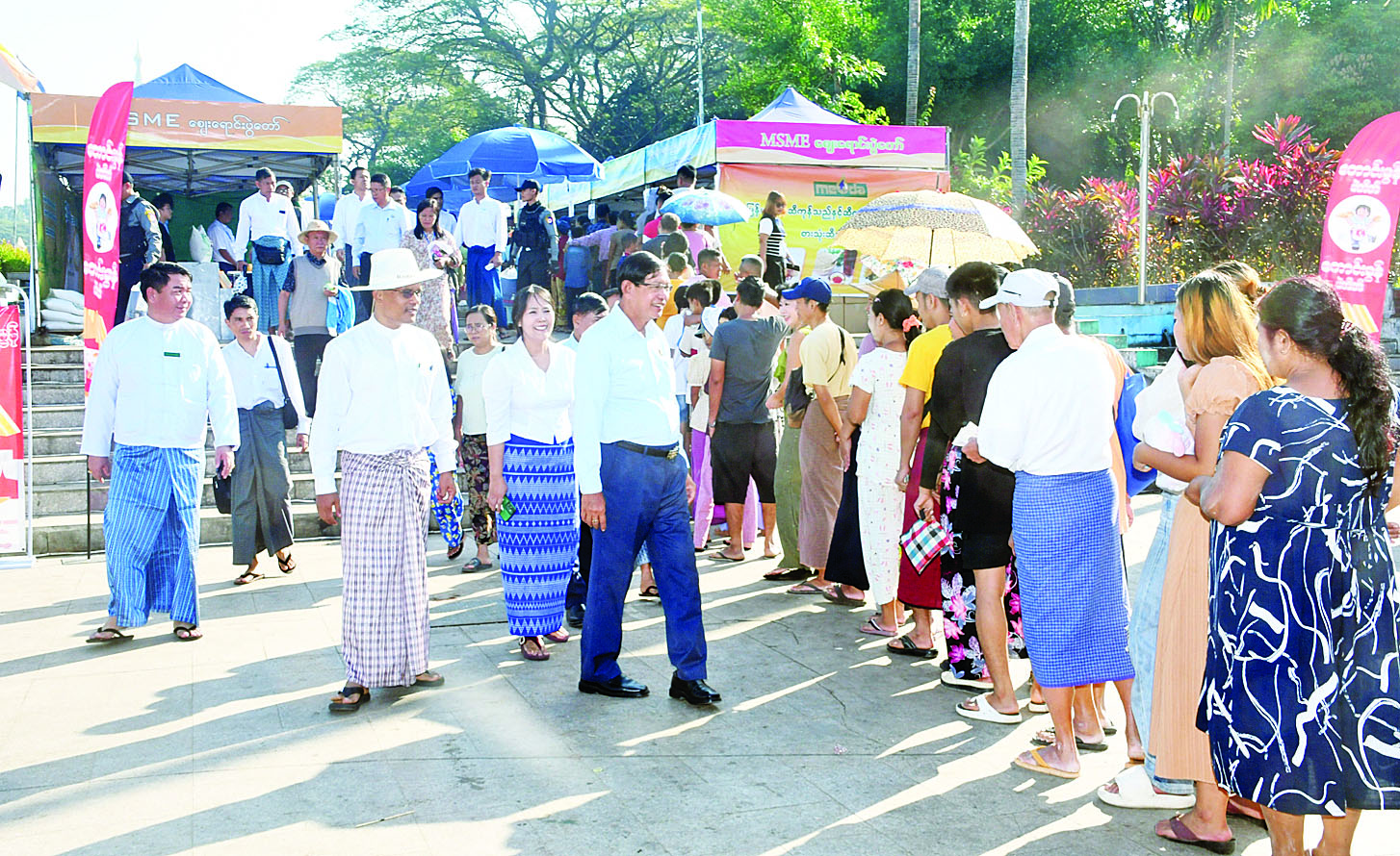 ပြည်သူ့ရင်ပြင်၌ ကျင်းပလျက်ရှိသည့် MSME စျေးရောင်းပွဲတော်တွင် ဝယ်ယူအားပေးသူပြည်သူများဖြင့် အထူးစည်ကား