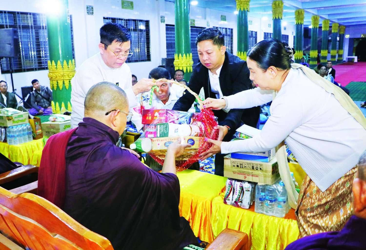ထို့နောက် ပြည်ထောင်စုဝန်ကြီး၊ မိသားစုနှင့် ဧည့်ပရိသတ်များက စာချ၊ စာသင်သံဃာတော်များအား သင်္ကန်းနှင့်ဝတ္ထုငွေများ ဆက်ကပ်လှူဒါန်းကြပြီး မိုးညိုပရိယတ္တိစာသင်တိုက် ဦးစီးပဓာနနာယက ဆရာတော်ထံမှ ငါးပါးသီလခံယူဆောက်တည်ကာ ဆရာတော်ကြီးများ ရွတ်ဖတ်ချီးမြှင့်တော်မူသည့် ပရိတ်တရားတော်များကို နာယူကြည်ညိုကြသည်။