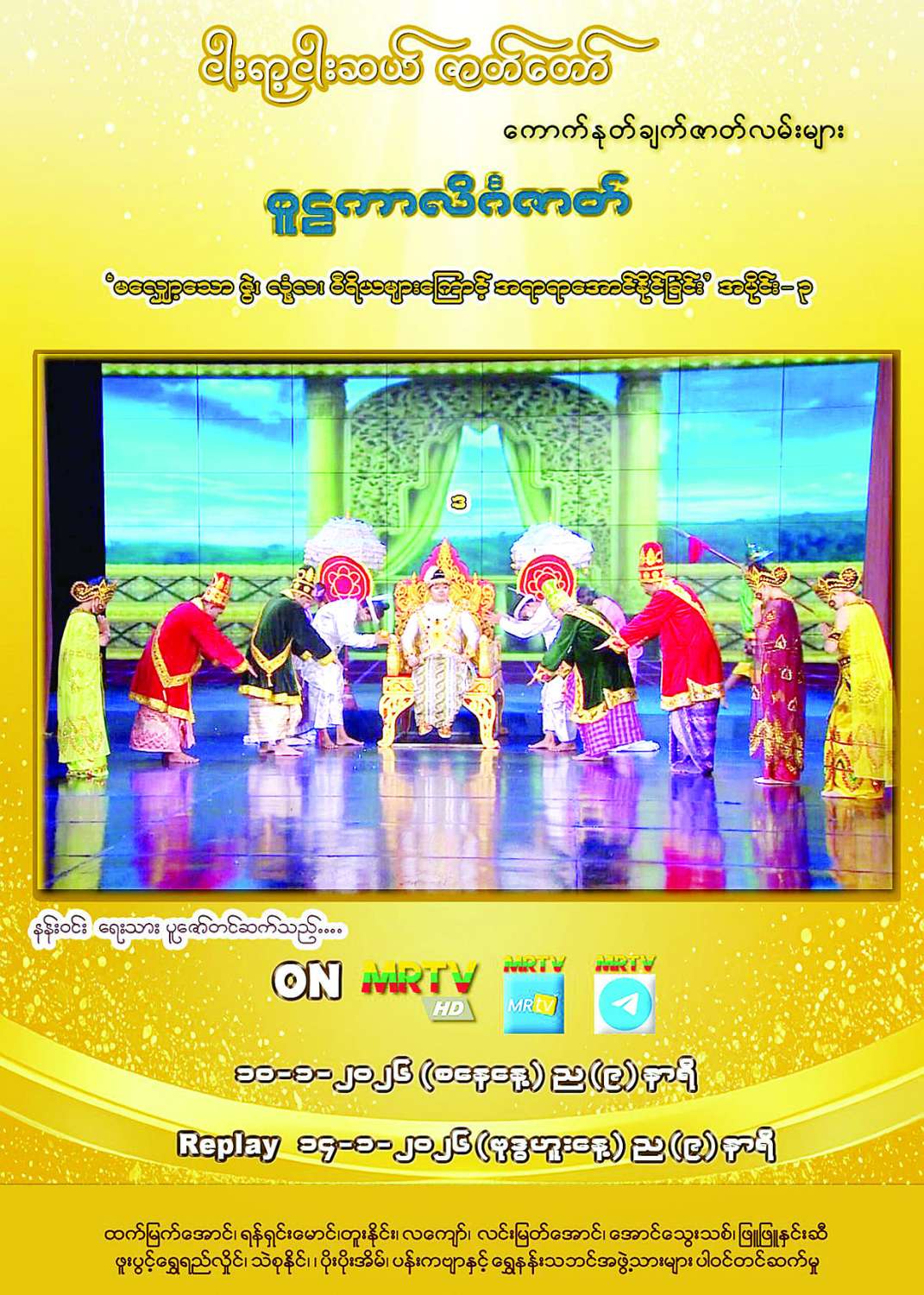 ငါးရာ့ငါးဆယ်ဇာတ်တော် ကောက်နုတ်ချက် ဇာတ်လမ်းများ ” အစီအစဉ်တွင် “မလျှော့သော ဇွဲ၊ လုံ့လ၊ ဝီရိယများကြောင့် အရာရာ အောင်နိုင်ခြင်း ကို ဖော်ပြထားသည့် စူဠ ကာလိင်္ဂဇာတ်တော် အပိုင်း(၃)ကို နန်းတော်ရှေ့ ဆရာတင်၏ မျိုးဆက်သဘင်ပညာရှင် ဦးနန်းဝင်းမှ ရေးသားပူဇော်ပြီး နန်းဝင်းနှင့် စုလှိုင်နှင်းတို့ ဦးဆောင်ကာ ထက်မြက်အောင်၊ ရန်ရှင်းမောင်၊ တူးနိုင်း၊ လကျော်၊ လင်းမြတ်အောင်၊ အောင်သွေးသစ်၊ ဖြူဖြူနှင်းဆီ၊ ဖူးပွင့်ရွှေရည်လှိုင်၊ သဲစုနိုင်၊ ပိုးပိုးအိမ်၊ ပန်းကဗျာနှင့် ရွှေနန်းသဘင်အဖွဲ့သားများက ပါဝင်ဖျော်ဖြေ တင်ဆက်ကြမည်ဖြစ်သည်။၊