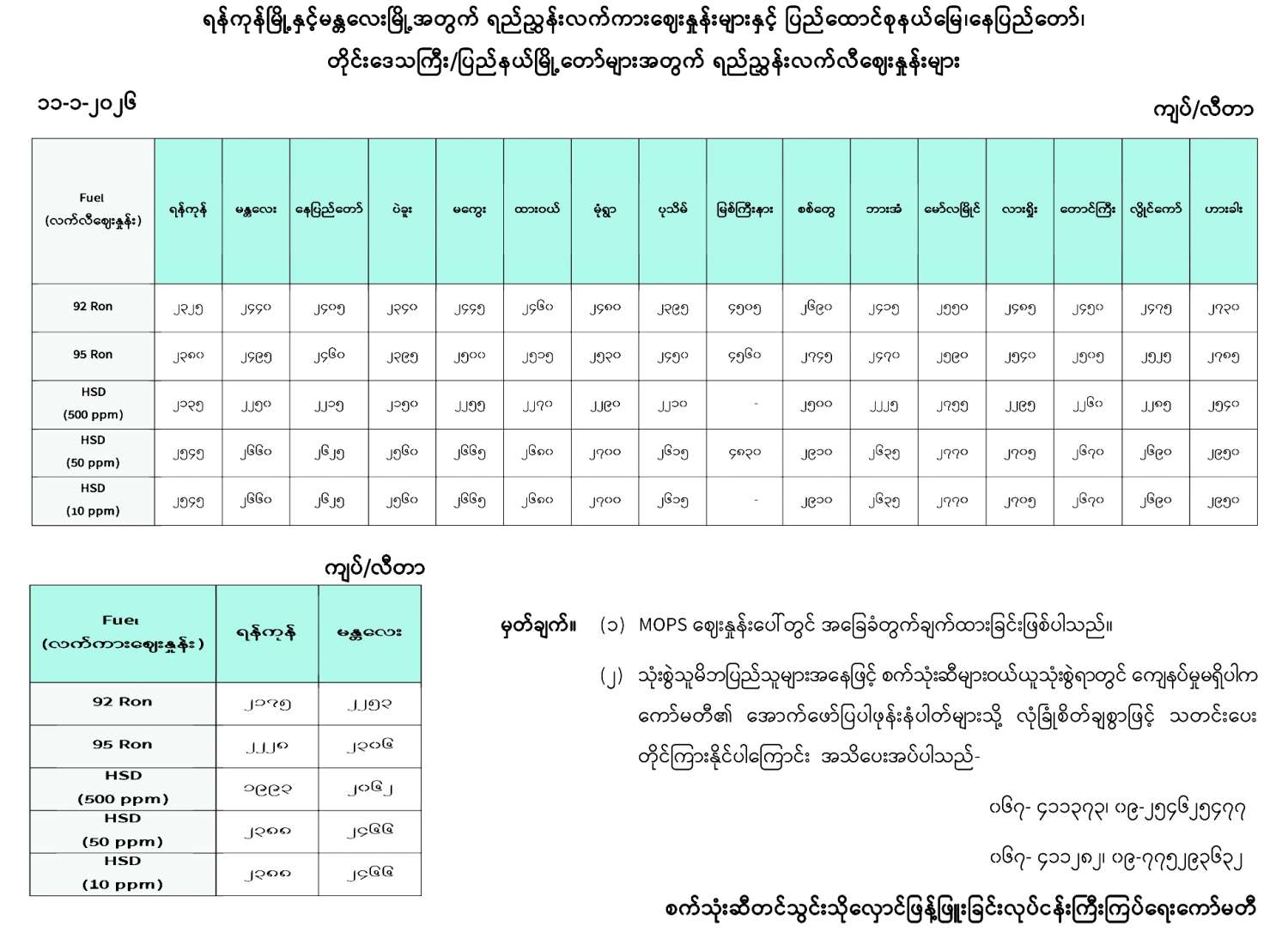 ရန်ကုန်မြို့နှင့် မန္တလေးမြို့အတွက် ရည်ညွှန်းလက်ကားဈေးနှုန်းများနှင့် ပြည်ထောင်စုနယ်မြေ နေပြည်တော်၊ တိုင်းဒေသကြီး/ပြည်နယ် မြို့တော်များအတွက် ရည်ညွှန်းလက်လီဈေးနှုန်းများ 01/11/2026