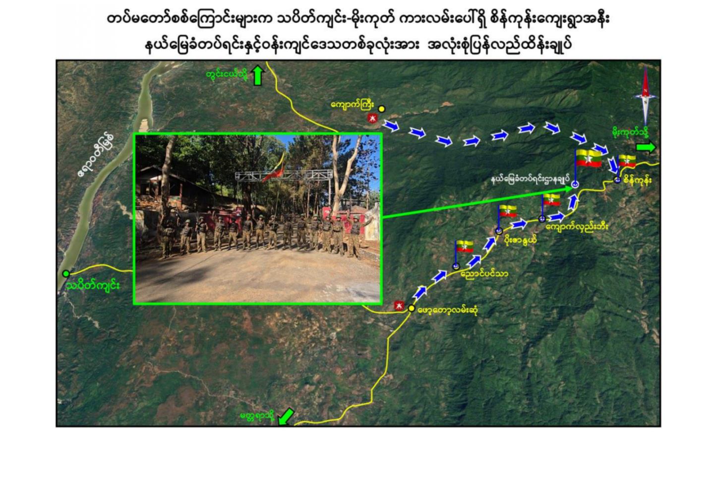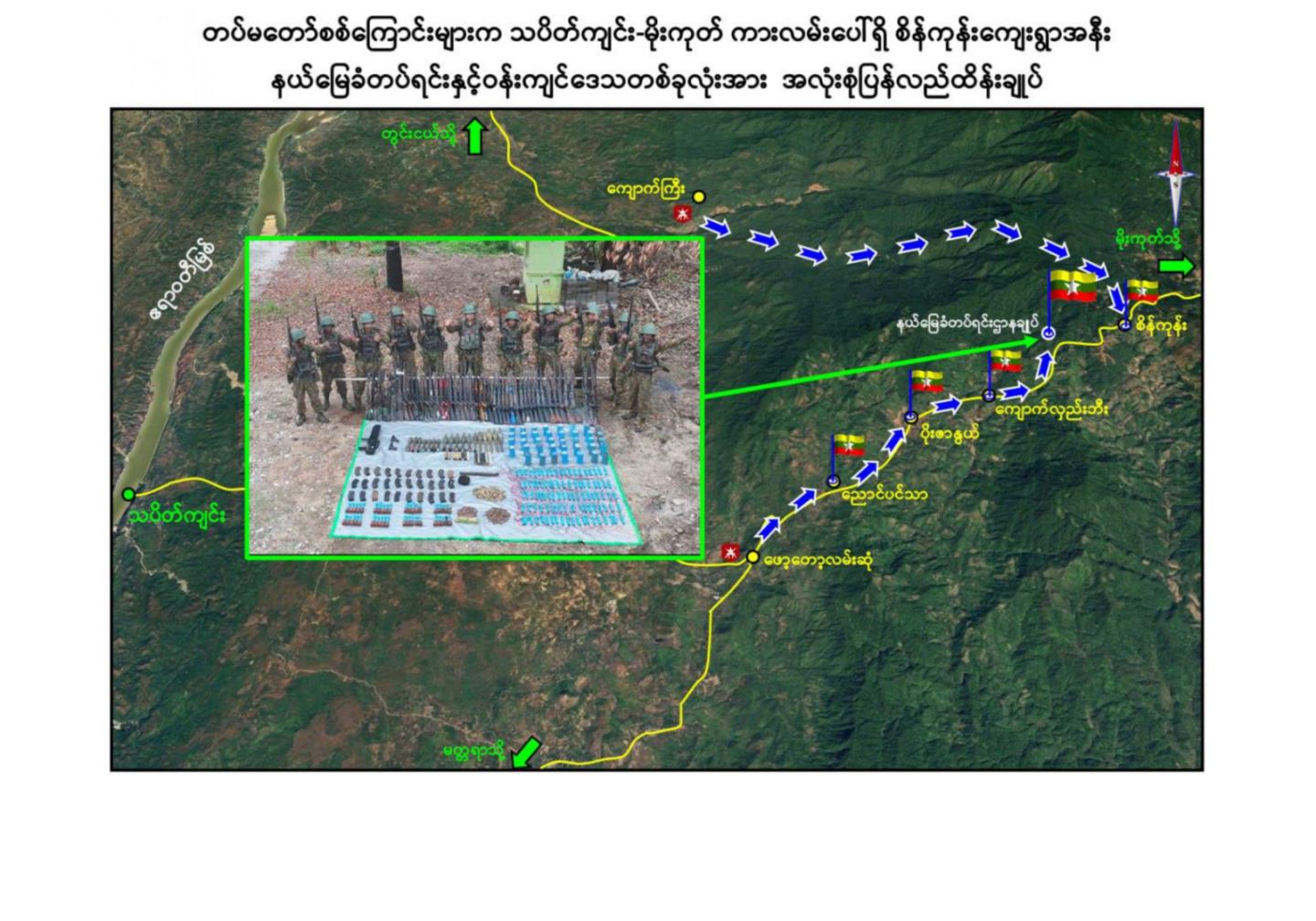 တပ်မတော်စစ်ကြောင်းများအနေဖြင့် သပိတ်ကျင်း-မိုးကုတ် ဒေသအနီးဝန်းကျင်ရှိ ဒေသခံပြည်သူများ၏ လူမှုစီးပွားဘဝများ လုံခြုံမှုရှိစေရေး၊ ကုန်စည်ကူးသန်းရောင်းဝယ်မှု လွယ်ကူလျင်မြန်စွာချောမွေ့စေရေးနှင့် နိုင်ငံ့စီးပွားတိုးတက်ရေးတို့အတွက် အထောက်အကူပြုသည့် မြေပေါ်/မြေအောက် သယံဇာတများ စနစ်တကျ စီမံဆောင်ရွက်နိုင်ရေးတို့အတွက် သပိတ်ကျင်း-မိုးကုတ် ဆက်သွယ်ရေးလမ်းကြောင်းအား အမြန်ဆုံး ပြန်လည်ဖွင့်လှစ်နိုင်ရေး အကြမ်းဖက်သောင်းကျန်းသူများ ယာယီစိုးမိုးထားသည့် နယ်မြေခံတပ်ရင်းဌာနချုပ်နှင့် ၎င်းဒေသတစ်ဝိုက်အား ပြန်လည်သိမ်းပိုက်ရရှိရေးအတွက် ဒေသခံပြည်သူများနှင့် အလင်းဝင်ရောက်လာသည့် PDF အဖွဲ့ဝင်များ၏ သတင်းပေးပို့မှုများကို စနစ်တကျပေါင်းစပ်သုံးသပ်ပြီး နယ်မြေလုံခြုံရေးလုပ်ငန်းများကို စစ်ကြောင်းများခွဲ၍ ဟန်ချက်ညီစွာ အရှိန်အဟန်ဖြင့် ဆက်လက်ချီတက်ခဲ့ရာ ၂၀၂၆ ခုနှစ်၊ ဇန်နဝါရီ ၁၁ ရက်နေ့တွင် ညောင်ပင်သာကျေးရွာအားလည်းကောင်း၊ ဇန်နဝါရီ ၁၂ ရက်နေ့တွင် ပိုးဇာနွယ်ကျေးရွာ အားလည်းကောင်း၊ ဇန်နဝါရီ ၁၃ ရက်နေ့တွင် ကျောက်လှည်းဘီးကျေးရွာအား လည်းကောင်း၊ ဇန်နဝါရီ ၁၄ ရက် ယနေ့တွင် အဆိုပါလမ်းကြောင်းပေါ်ရှိ နယ်မြေခံတပ်ရင်းဌာနချုပ်နှင့် စိန်ကုန်းကျေးရွာတစ်ဝိုက်တို့အားလည်းကောင်း တပ်မတော်စစ်ကြောင်းများက အပြည့်အဝ ပြန်လည်သိမ်းပိုက်ထိန်းချုပ်နိုင်ခဲ့သည်။