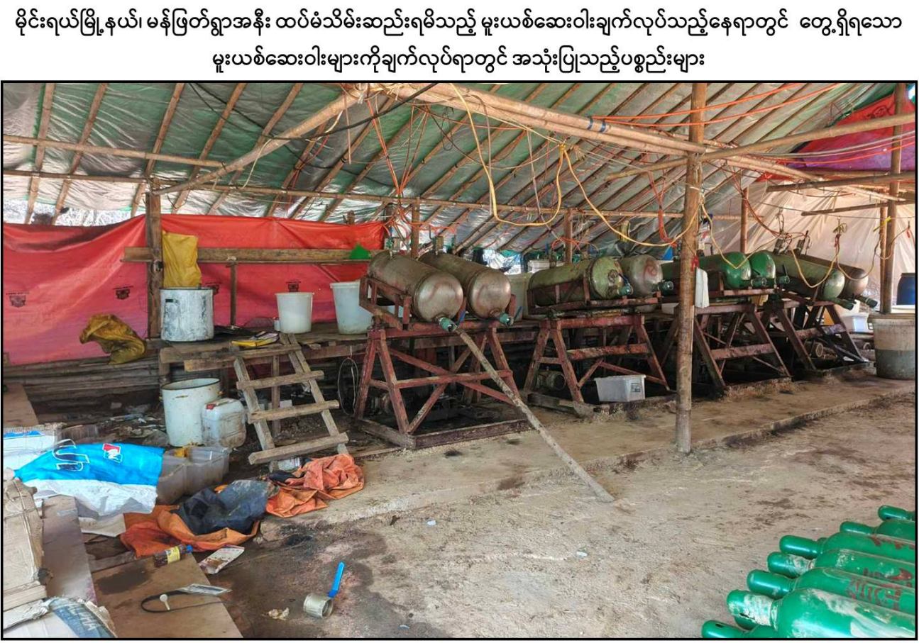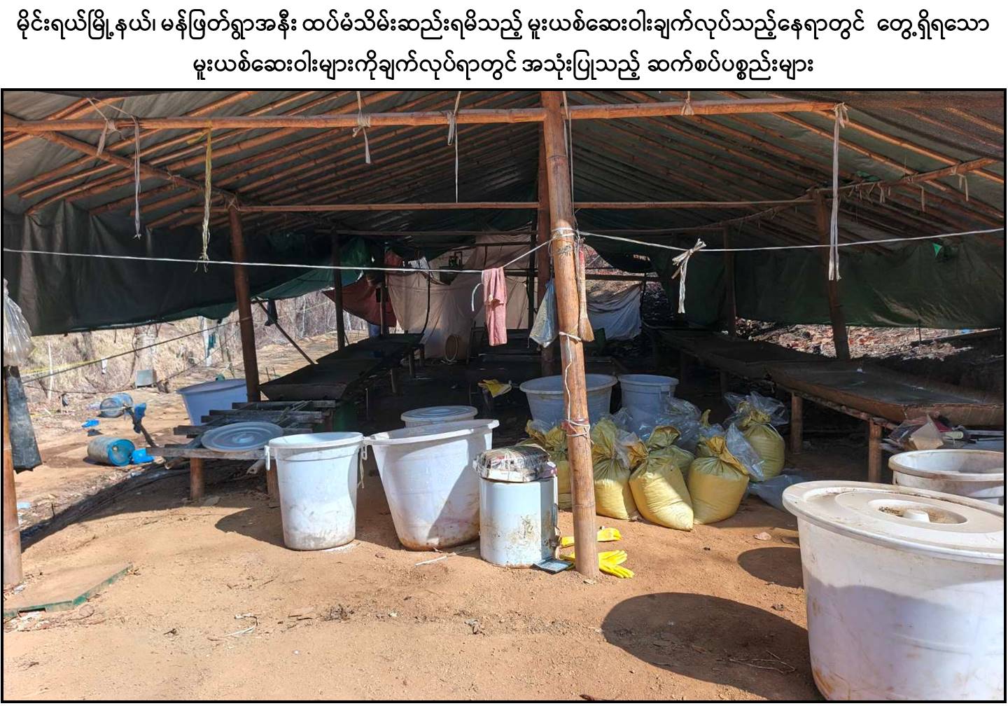 အလားတူ နံနက် ၁၁ နာရီ ၄၅ မိနစ်ခန့်တွင် ယမန်နေ့က ဖမ်းဆီးရမိခဲ့သည့်နေရာ၏ အနောက်မြောက်ဘက် ၂ ကီလိုမီတာခန့်အကွာ ၊ သီပေါ - မိုင်းရယ်သွားကားလမ်းအနီးရှိ စိန်ကြော့ကျေးရွာ၏ အရှေ့တောင်ဘက် ၁၅ ကီလိုမီတာခန့်အကွာတွင် မသင်္ကာဖွယ်ရာ အဆောက်အအုံများတွေ့ရှိရသဖြင့် သွားရောက်ရှင်းလင်းခြင်းဆောင်ရွက်ခဲ့ရာ မူးယစ်ဆေးဝါးချက်လုပ်ရာတွင် အသုံးပြုသည့် လူ ၅ ဦးဆန့် လူနေတဲ ၃၅ လုံး၊ Lovon အမျိုးအစား ဘက်ဟိုး ၁ စီး၊ အလျား ၃၀ ပေ၊ အနံ ၁၅ ပေရှိ ဝါးဂိုဒေါင် ၂ လုံး၊ အက်ဆစ် ၁၅ ဂါလံပုံး ၇၀ လုံး၊ အရှည်ပေ ၃၀၀ ခန့်ရှိ တဲ ၁ လုံး၊ အခြောက်ခံဗန်း ၃ ချပ်၊ မူးယစ်ဆေးဝါးချက်လုပ်သည့် ဖို ၃ ခု၊ ဂက်စ်အိုး ၁၅၀ လုံး၊ ကျောက်ချဉ်အိတ် ၁၅၀ လုံး၊ ဆာလဖြူရစ် အက်ဆစ်ထည့်သောပုံးပြာ (အရည်ပါ) ၅၀၀ လုံး၊ ပုံးပြာအခွံ ၁၀၀၀ လုံး၊ ဆာလာအိတ်များဖြင့်ထည့်ထားသည့် Caustic Soda ၁၅၀ အိတ်၊ ဆပ်ပြာခွက်များထည့်ထားသည့် ကတ်ထူဖာ ၃၀၀ ဖာ တို့ကို ရှာဖွေဖော်ထုတ်သိမ်းဆည်းနိုင်ခဲ့ပြီး ထပ်မံ၍ရှာဖွေစစ်ဆေးခြင်းများ ဆောင်ရွက်ခဲ့ရာ မွန်းလွဲ ၁ နာရီခန့်တွင် အဆိုပါနေရာ၏ အနောက်မြောက်ဘက် ၄ ကီလိုမီတာခန့်အကွာ၌ မူးယစ်ဆေးဝါးချက်လုပ်ရာတွင် အသုံးပြုသည့် ဘွိုင်လာအိုး ၂ လုံးပါ အလျား ၉၀ ပေ၊ အနံ ၄၀ ပေရှိ အဆောက်အအုံ ၁ လုံး၊ ရေထည့် Boxer ကန် ၂ လုံး၊ Liugong အမျိုးအစား Loader ၁ စီးနှင့် အလျား ၄၀ ပေ၊ အနံ ၂၀ ပေရှိ လူနေတဲ ၃ လုံးတို့ကို ထပ်မံတွေ့ရှိသိမ်းဆည်းရမိခဲ့သည်။