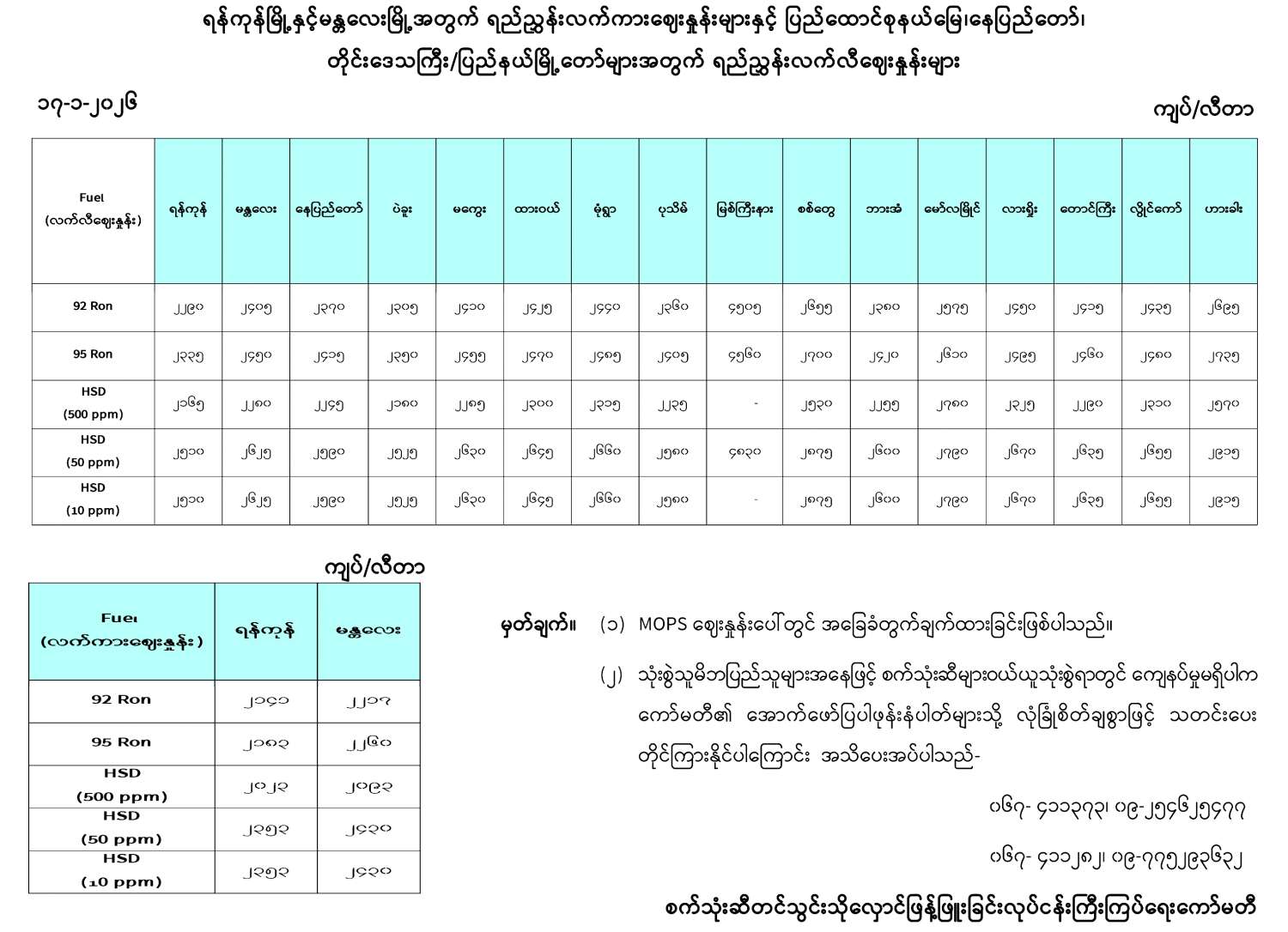 ရန်ကုန်မြို့နှင့် မန္တလေးမြို့အတွက် ရည်ညွှန်းလက်ကားဈေးနှုန်းများနှင့် ပြည်ထောင်စုနယ်မြေ နေပြည်တော်၊ တိုင်းဒေသကြီး/ပြည်နယ် မြို့တော်များအတွက် ရည်ညွှန်းလက်လီဈေးနှုန်းများ 01/18/2026