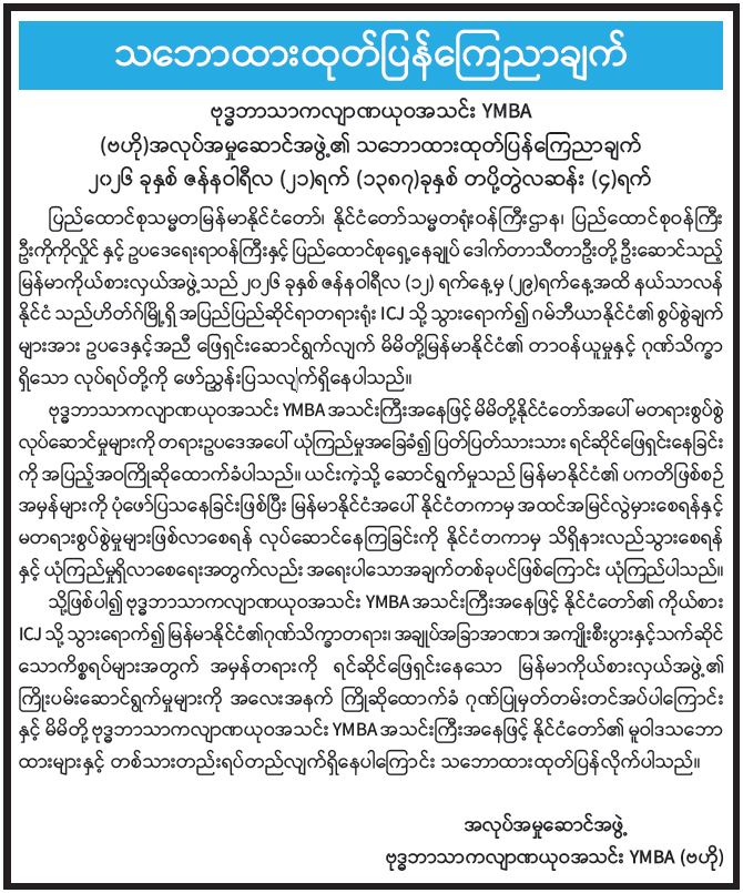 ဗုဒ္ဓဘာသာကလျာဏယုဝအသင်း YMBA (ဗဟို)အလုပ်အမှုဆောင်အဖွဲ့၏ သဘောထားထုတ်ပြန်ကြေညာချက်