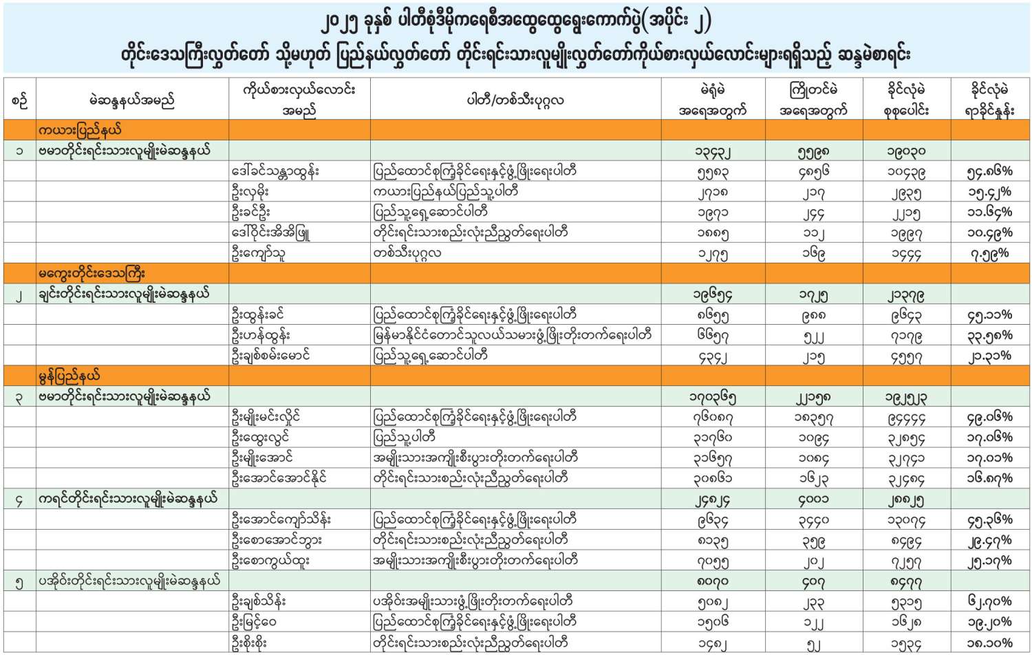 ၂၀၂၅ ခုနှစ် ပါတီစုံဒီမိုကရေစီအထွေထွေရေးကောက်ပွဲ(အပိုင်း ၂) တိုင်းဒေသကြီးလွှတ်တော် သို့မဟုတ် ပြည်နယ်လွှတ်တော် တိုင်းရင်းသားလူမျိုးလွှတ်တော်ကိုယ်စားလှယ်လောင်းများ ရရှိသည့် ဆန္ဒမဲစာရင်း