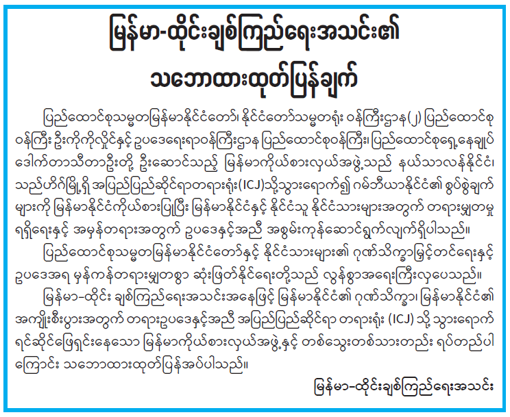 မြန်မာ-ထိုင်းချစ်ကြည်ရေးအသင်း၏ သဘောထားထုတ်ပြန်ချက်