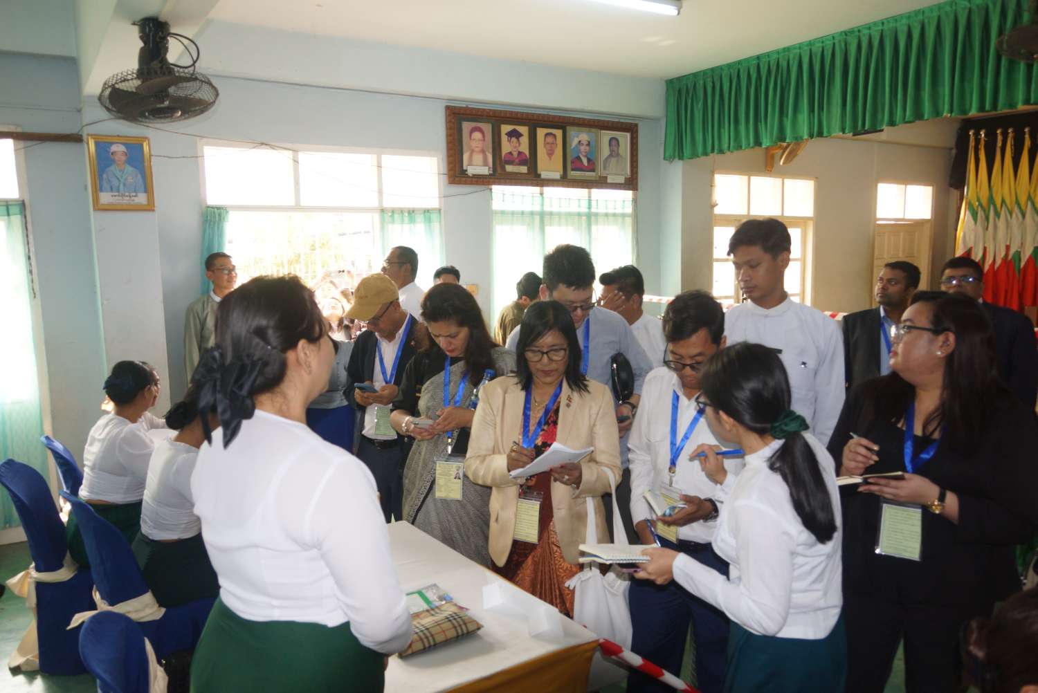 နိုင်ငံတကာရွေးကောက်ပွဲ စောင့်ကြည့်လေ့လာရေးအဖွဲ့များဖြစ်သည့် ဘယ်လာရုစ်သမ္မတနိုင်ငံမှ ကိုယ်စားလှယ်အဖွဲ့၊ ကမ္ဘောဒီးယားနိုင်ငံရွေးကောက်ပွဲကော်မရှင်မှကိုယ်စားလှယ်အဖွဲ့၊ နီပေါနိုင်ငံရွေးကောက်ပွဲကော်မရှင်မှကိုယ်စားလှယ်အဖွဲ့၊ အင်ဒိုနီးရှားနိုင်ငံ ရွေးကောက်ပွဲကော်မရှင်မှကိုယ်စားလှယ်အဖွဲ့၊ ဗီယက်နမ်ဆိုရှယ်လစ်သမ္မတနိုင်ငံမှကိုယ်စားလှယ်အဖွဲ့၊ နီကာရာဂွါနိုင်ငံမှ ကိုယ်စားလှယ်အဖွဲ့၊ အိန္ဒိယနိုင်ငံမှကိုယ်စားလှယ်နှင့် International Conference of Asian Political Parties(ICAPP)အဖွဲ့မှ ကိုယ်စားလှယ်များသည် ပြည်ထောင်စုရွေးကောက်ပွဲကော်မရှင်ရုံးမှ တာဝန်ရှိသူများ၊ ရန်ကုန်တိုင်းဒေသကြီး ရွေးကောက်ပွဲကော်မရှင်အဖွဲ့ခွဲမှ တာဝန်ရှိသူများက ဒဂုံမြို့နယ်ပြည်လမ်း(အရှေ့)ရပ်ကွက်ရှိမဲရုံအမှတ်(၂)၊ လမ်းမတော်မြို့နယ်အမှတ်(၈)ရပ်ကွက်ရှိမဲရုံအမှတ်(၁)၊ သာကေတမြို့နယ် အမှတ်(၇)ရပ်ကွက်(အနောက်)ရှိ မဲရုံအမှတ်(၁)၊ မဲရုံအမှတ်(၂)နှင့် မဲရုံအမှတ်(၃)များသို့ရောက်ရှိပြီး မဲဆန္ဒရှင်ပြည်သူများ လွတ်လပ်စွာဆန္ဒမဲပေးနေမှု၊ မဲရုံတာဝန်ရှိသူများမှ ပြည်သူများအဆင်ပြေစွာ ဆန္ဒမဲပေးနိုင်ရေး ကူညီဆောင်ရွက်ပေးနေမှုများကို လေ့လာကြည့်ရှုပြီး မဲရုံတာဝန်ထမ်းဆောင်ကြသူများနှင့် လွတ်လပ်စွာဆန္ဒမဲလာရောက်ပေးလျက်ရှိသော ပြည်သူများအားတွေ့ဆုံ၍ သိရှိလိုသည်များကို ဆွေးနွေးမေးမြန်းခဲ့ကြကြောင်းသိရသည်။