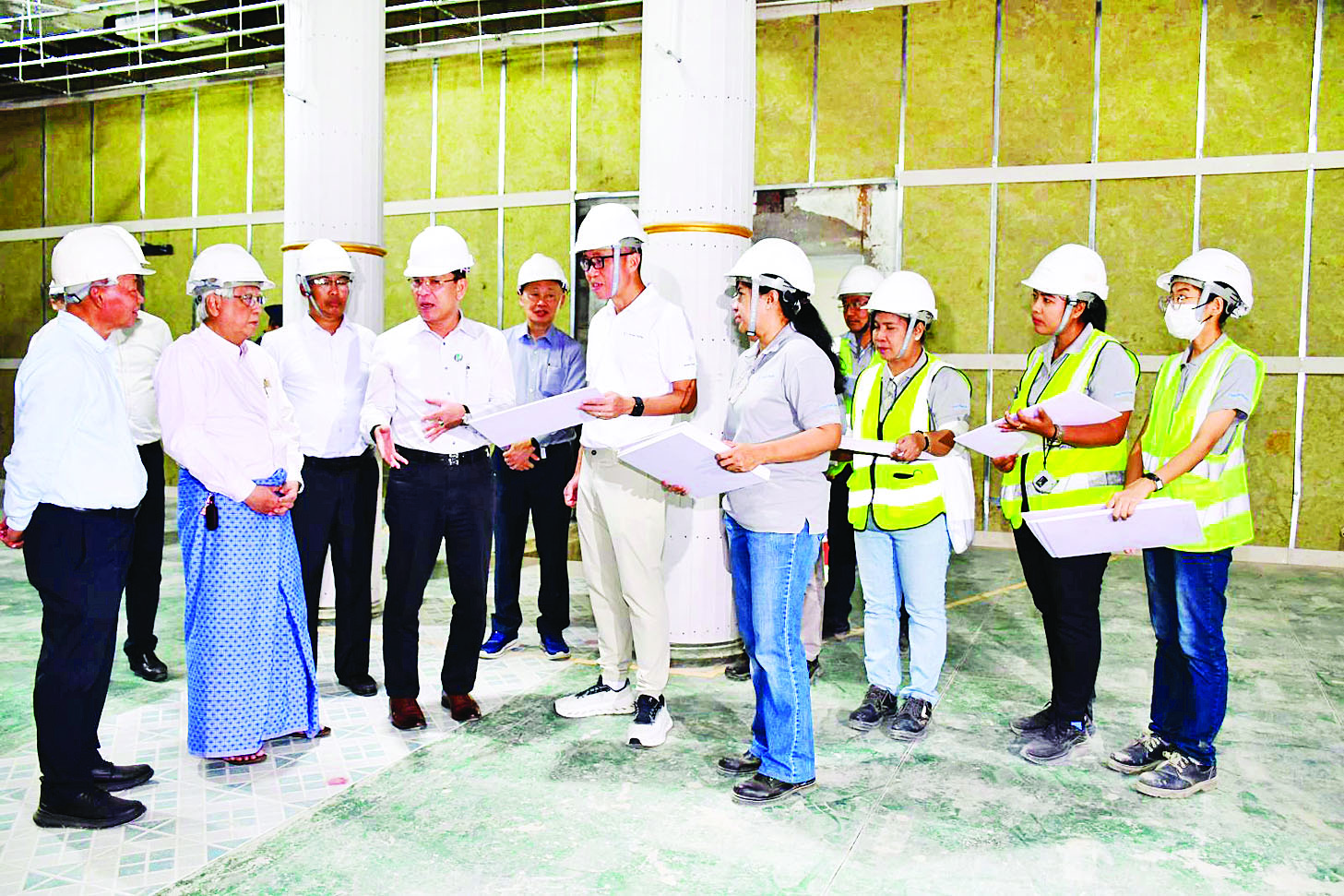 ဆက်လက်၍ စာဆိုဗိမာန် သုံးထပ် (RC) အဆောက်အအုံတည်ဆောက်ရေး လုပ်ငန်းခွင်သို့ ရောက်ရှိရာ ရှင်းလင်းဆောင်ခန်းမ၌ ပုံနှိပ်ရေးနှင့် ထုတ်ဝေရေးဦးစီးဌာန ညွှန်ကြားရေးမှူးချုပ်နှင့် စာဆိုဗိမာန်ကို တာဝန်ယူတည်ဆောက်နေသည့် Myanmar Land & Development Ltd Project Director တို့က စာဆိုဗိမာန်အဆောက်အအုံ ၈၈ ရာခိုင်နှုန်း တည်ဆောက်ပြီးစီးနေမှုနှင့် စပ်လျဉ်း၍ ရှင်းလင်းတင်ပြကြသည်။