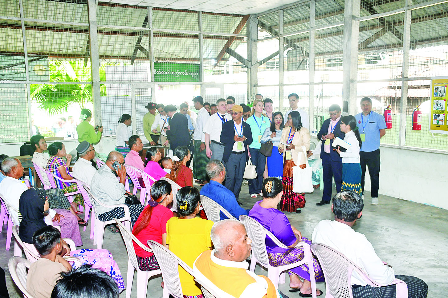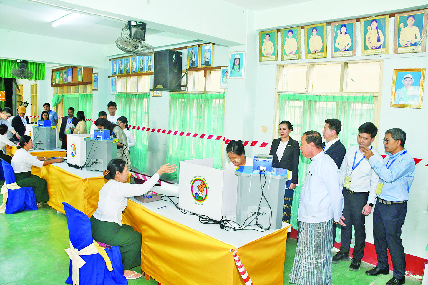 ပြည်ထောင်စုရွေးကောက်ပွဲကော်မရှင်အဖွဲ့ဝင် ဦးမျိုးလှိုင်နှင့်အတူ နိုင်ငံတကာရွေးကောက်ပွဲ စောင့်ကြည့်လေ့လာရေးအဖွဲ့များဖြစ်ကြသည့် ဘယ်လာရုစ်သမ္မတနိုင်ငံမှ Ms. Volha N. Chamadanova ဦးဆောင်သော ကိုယ်စားလှယ်အဖွဲ့၊ ကမ္ဘောဒီးယားနိုင်ငံ ရွေးကောက်ပွဲကော်မရှင်အဖွဲ့ဝင် Mr. Yich Samethy ဦးဆောင်သော ကိုယ်စားလှယ်အဖွဲ့၊ နီပေါနိုင်ငံရွေးကောက်ပွဲကော်မရှင်အဖွဲ့ဝင် Dr. Janaki Kumari Tuladhar ဦးဆောင်သော ကိုယ်စားလှယ်အဖွဲ့၊ အင်ဒိုနီးရှားနိုင်ငံ ရွေးကောက်ပွဲကော်မရှင်အဖွဲ့ဝင် Ms. Yusti Erlina ဦးဆောင်သော ကိုယ်စားလှယ်အဖွဲ့၊ နီကာရာဂွါနိုင်ငံမှ Mr. Mario Jose Armengol Campos ဦးဆောင်သော ကိုယ်စားလှယ်အဖွဲ့၊ ဗီယက်နမ်ဆိုရှယ်လစ်သမ္မတနိုင်ငံမှ Mr. Nguyen Xuan Loc ဦးဆောင်သော ကိုယ်စားလှယ်အဖွဲ့၊ အိန္ဒိယနိုင်ငံမှ Ms. Rami Niranjan Desai၊ International Con-ference of Asian Political Parties (ICAPP) အဖွဲ့မှ Dr.Chheng Kimlong ဦးဆောင်သော ကိုယ်စားလှယ်အဖွဲ့နှင့် ပြည်တွင်းအခြေစိုက် နိုင်ငံတကာသံရုံးများမှ ကိုယ်စားလှယ်များသည် ယနေ့နံနက်ပိုင်းတွင် ဒဂုံမြို့နယ် ပြည်လမ်းအရှေ့ရပ်ကွက် မဲရုံအမှတ် (၂)၊ လမ်းမတော်မြို့နယ် အမှတ် (၈) ရပ်ကွက် မဲရုံအမှတ် (၁)၊ သာကေတမြို့နယ် အမှတ် (၇) ရပ်ကွက် (အနောက်) မဲရုံအမှတ် (၁) နှင့် မဲရုံအမှတ် (၂) တို့၌လည်းကောင်း၊ မွန်းလွဲပိုင်းတွင် ဒဂုံမြို့သစ် (ဆိပ်ကမ်း) မြို့နယ်အမှတ် (၆၁) ရပ်ကွက် မဲရုံအမှတ် (၁)၊ တာမွေမြို့နယ် နတ်မောက်ရပ်ကွက် မဲရုံအမှတ် (၁)၊ ဗျိုင်းရေအိုးစင်ကွက်သစ်ရပ်ကွက် မဲရုံအမှတ် (၁)၊ ရန်ကင်းမြို့နယ် အမှတ် (၁၄) ရပ်ကွက် မဲရုံအမှတ် (၁) တို့၌လည်းကောင်း မဲဆန္ဒရှင်ပြည်သူများက မြန်မာအီလက်ထရောနစ်မဲပေးစက် (MEVM) အသုံးပြု၍ လွှတ်တော်ကိုယ်စားလှယ်လောင်းများအား လွတ်လပ်စွာ ဆန္ဒပြုမဲပေးရွေးချယ်နေမှု၊ ရွေးကောက်ပွဲဆိုင်ရာစံနှုန်းများ၊ အလေ့အကျင့်ကောင်းများနှင့်အညီ လွတ်လပ်၍တရားမျှတသော ရွေးကောက်ပွဲဖြစ်စေရေး ဆောင်ရွက်နေမှုများကို လေ့လာစောင့်ကြည့်ကြပြီး မဲရုံမှူးများ၊ တာဝန်ရှိသူများ၊ မဲဆန္ဒရှင်ပြည်သူများကို တွေ့ဆုံ၍ ၎င်းတို့သိရှိလိုသည်များကို မေးမြန်းဆွေးနွေးခဲ့ကြကြောင်း သိရသည်။
