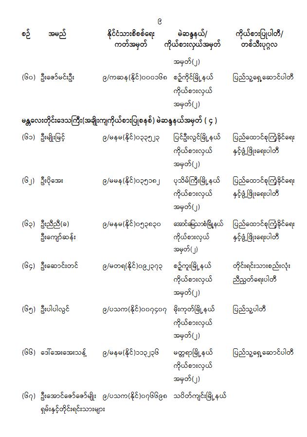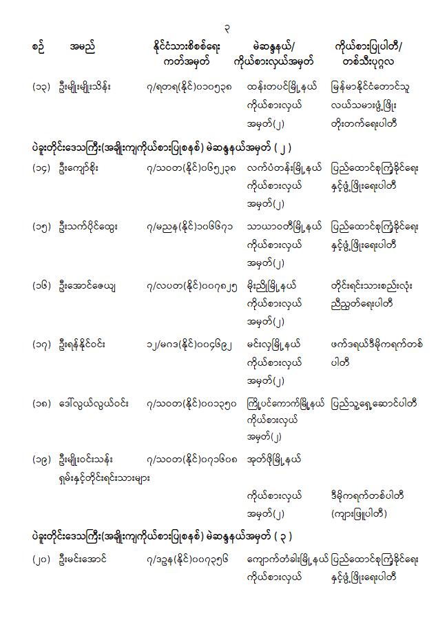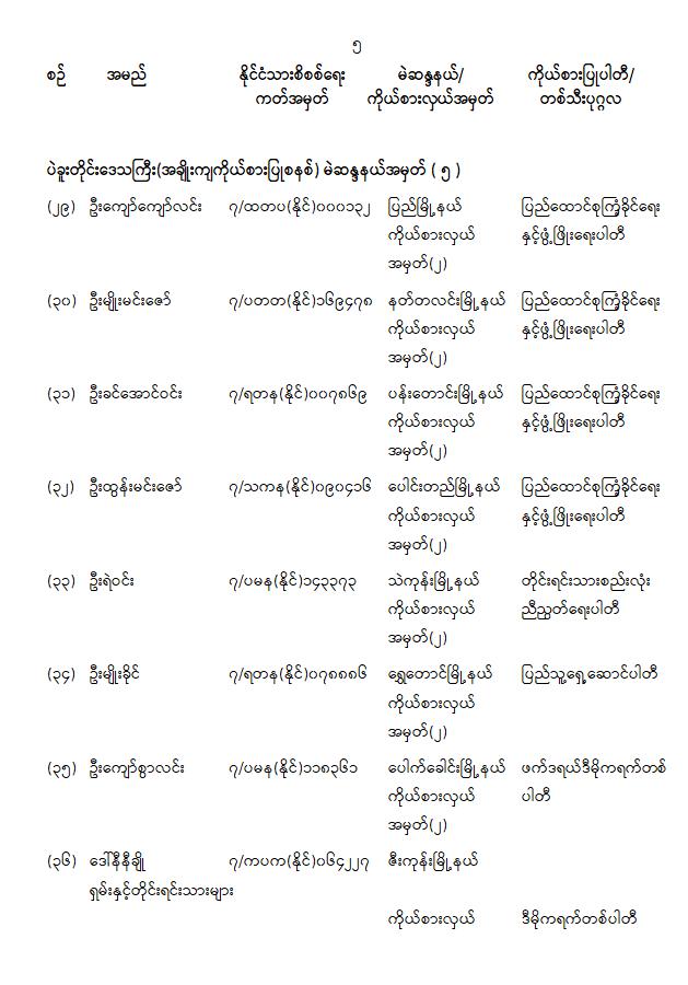 တိုင်းဒေသကြီးလွှတ်တော် သို့မဟုတ် ပြည်နယ်လွှတ်တော်ကိုယ်စားလှယ်အဖြစ် ရွေးကောက်တင်မြှောက်ခံရသူများ အမည်စာရင်းကြေညာခြင်း 01/31/2026 တိုင်းဒေသကြီးလွှတ်တော် သို့မဟုတ် ပြည်နယ်လွှတ်တော်ကိုယ်စားလှယ်အဖြစ် ရွေးကောက်တင်မြှောက်ခံရသူများ အမည်စာရင်းကြေညာခြင်း