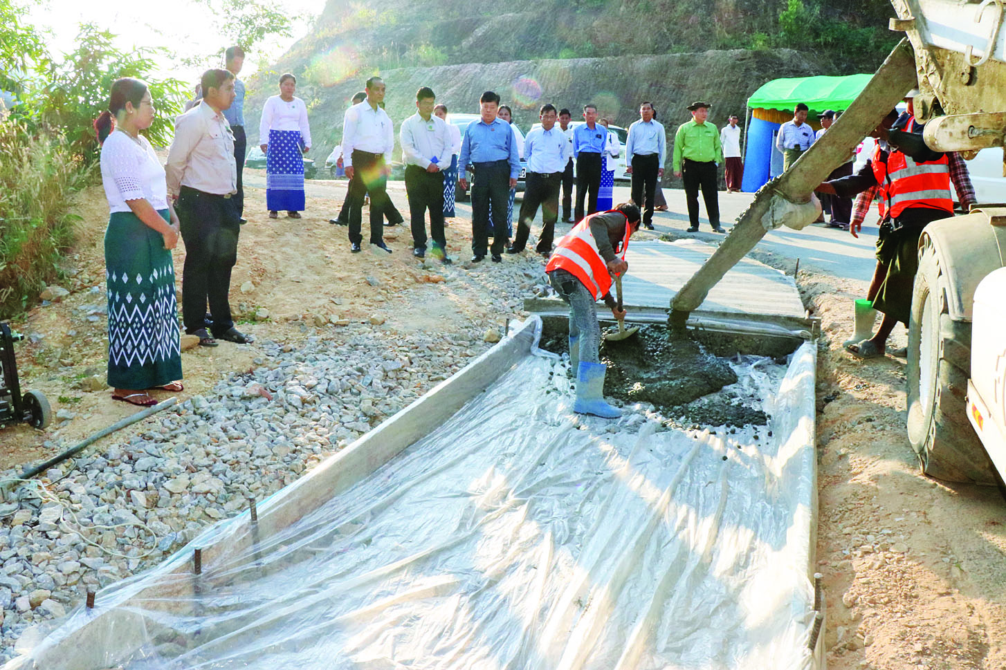ဦးစွာ ပြည်နယ်ဦးစီးမှူးက လုပ်ငန်းဆောင်ရွက်နေမှုအခြေအနေကို ရှင်းလင်းတင်ပြရာ ဒုတိယဝန်ကြီးက တောင်ဖြတ်လမ်း ရေရှည်အသုံးပြုနိုင်ရေးအတွက် လိုအပ်သည့်နေရာများတွင် မြေထိန်းနံရံများ၊ ရေတိုက်စားမှုကာကွယ်ရေးအစီအမံများ ဆောင်ရွက်သွားရန်မှာကြားပြီး လိုအပ် သည်များ ညှိနှိုင်းပေါင်းစပ်ဆောင်ရွက်ပေးကာ ရွာလွတ်လယ်ယာနှင့် အထွေထွေစီးပွားရေးသမဝါယမအသင်း၏ ရွာလွတ်ထုတ်ကုန်အမှတ်တရပစ္စည်း အရောင်းပြခန်းကို ကြည့်ရှုစစ်ဆေးသည်။