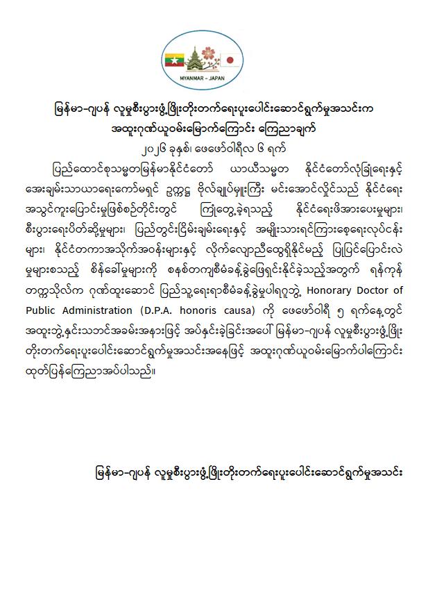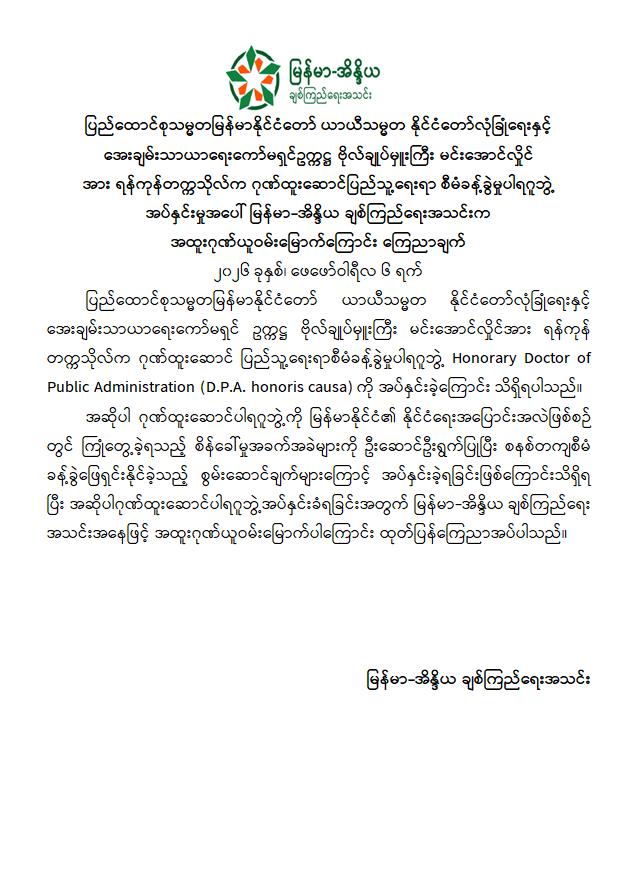 ပြည်ထောင်စုသမ္မတမြန်မာနိုင်ငံတော် ယာယီသမ္မတ နိုင်ငံတော်လုံခြုံရေးနှင့်အေးချမ်းသာယာရေးကော်မရှင်ဥက္ကဋ္ဌ ဗိုလ်ချုပ်မှူးကြီး မင်းအောင်လှိုင်အား ရန်ကုန်တက္ကသိုလ်က ဖေဖော်ဝါရီ ၅ ရက်တွင် အထူးဘွဲ့နှင်းသဘင်အခမ်းအနားဖြင့် ဂုဏ်ထူးဆောင်ပြည်သူ့ရေးရာ စီမံခန့်ခွဲမှုပါရဂူဘွဲ့ Honorary Doctor of Public Administration (D.P.A. honoris causa) ကို ချီးမြှင့်အပ်နှင်းခဲ့ရာ ထိုသို့ဂုဏ်ထူးဆောင်ပါရဂူဘွဲ့ လက်ခံရရှိမှုအပေါ် အဖွဲ့အစည်းအသီးသီးက အထူးဂုဏ်ယူဝမ်းမြောက်ကြောင်း ထုတ်ပြန်ကြေညာချက်များကို ယနေ့တွင် ထုတ်ပြန်ကြေညာကြသည်။