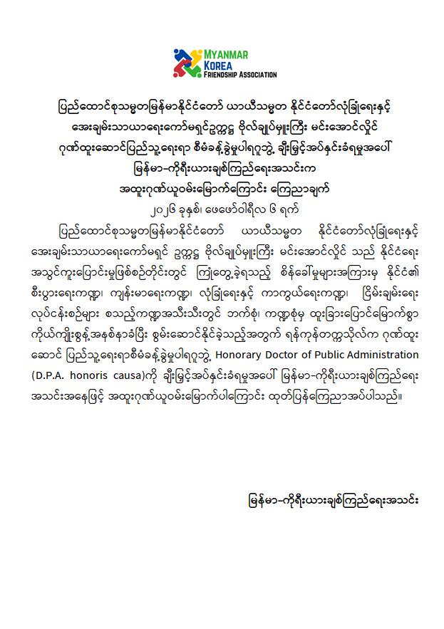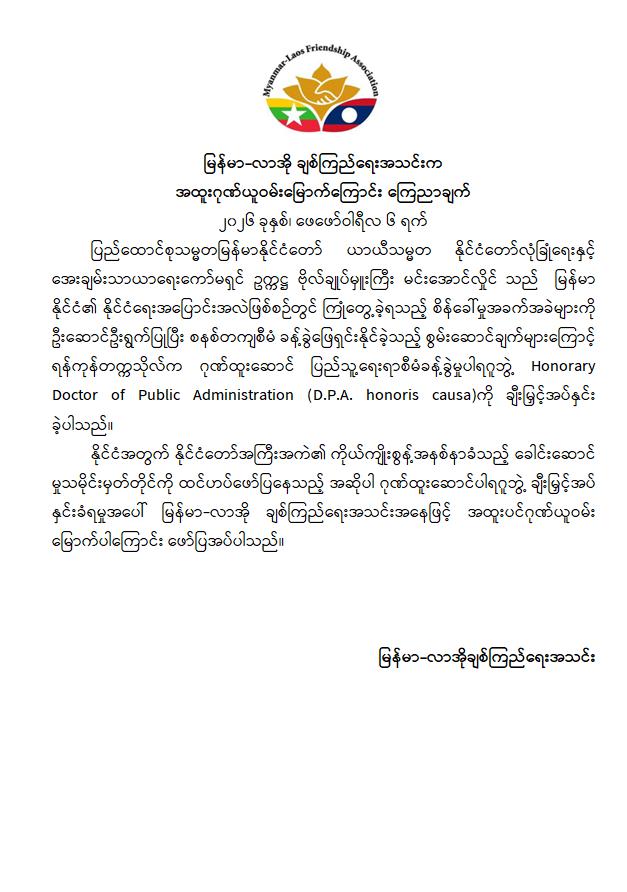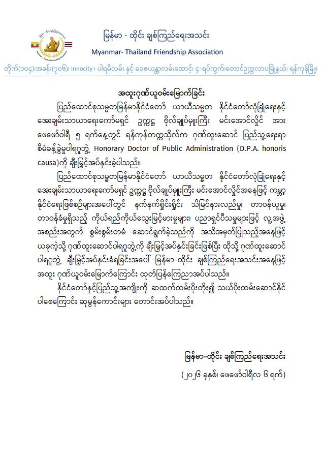 ပြည်ထောင်စုသမ္မတမြန်မာနိုင်ငံတော် ယာယီသမ္မတ နိုင်ငံတော်လုံခြုံရေးနှင့်အေးချမ်းသာယာရေးကော်မရှင်ဥက္ကဋ္ဌ ဗိုလ်ချုပ်မှူးကြီး မင်းအောင်လှိုင်သည် မြန်မာနိုင်ငံ၏ နိုင်ငံရေးအပြောင်းအလဲဖြစ်စဉ်တွင် ကြုံတွေ့ခဲ့ရသည့် စိန်ခေါ်မှုအခက်အခဲများကို ဦးဆောင်ဦးရွက်ပြုပြီး စနစ်တကျစီမံခန့်ခွဲဖြေရှင်းနိုင်ခဲ့သည့် စွမ်းဆောင်ချက်များနှင့် နိုင်ငံတော်နှင့် ပြည်သူ့အကျိုးအတွက် စွမ်းစွမ်းတမံကြိုးပမ်းဆောင်ရွက်ခဲ့သည့်အတွက် ထိုသို့ထူးကဲသော ဂုဏ်ဒြပ်များကို ဂုဏ်ပြုသောအားဖြင့် ရန်ကုန်တက္ကသိုလ်က ချီးမြှင့်ပေးအပ်သည့် ဂုဏ်ထူးဆောင်ပြည်သူ့ရေးရာစီမံခန့်ခွဲမှုပါရဂူဘွဲ့ Honorary Doctor of Public Administration (D.P.A. honoris causa) ကို ရရှိခဲ့ခြင်းအတွက် မြန်မာ - အိန္ဒိယချစ်ကြည်ရေးအသင်း၊ မြန်မာ-ဂျပန်လူမှုစီးပွားဖွံ့ဖြိုးတိုးတက်ရေး ပူးပေါင်းဆောင်ရွက်မှုအသင်း၊ မြန်မာ-ကိုရီးယားချစ်ကြည်ရေးအသင်း၊ မြန်မာ-ထိုင်းချစ်ကြည်ရေးအသင်းနှင့် မြန်မာ-လာအိုချစ်ကြည်ရေးအသင်းတို့က အထူးဂုဏ်ယူဝမ်းမြောက်ကြောင်း ကြေညာချက်များ ထုတ်ပြန်ခဲ့ကြကြောင်း သတင်းရရှိသည်။