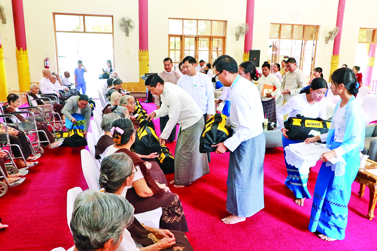 လူမှုဝန်ထမ်း၊ ကယ်ဆယ်ရေးနှင့် ပြန်လည်နေရာချထားရေးဝန်ကြီးဌာန ပြည်ထောင်စုဝန်ကြီး ဒေါက်တာစိုးဝင်းသည် တာဝန်ရှိသူများနှင့်အတူ ယနေ့မွန်းလွဲပိုင်းတွင် အေးငြိမ်းချမ်းသာ ဂိလာနဘိုးဘွားရိပ်သာ၊ ပျဉ်းမနားဘိုးဘွားရိပ်သာနှင့် ကရုဏာကမ္ဘာဘိုးဘွားရိပ်သာတို့ကို သွားရောက်ပြီး ဘိုးဘွားရိပ်သာများမှ သက်ကြီးပုဂ္ဂိုလ်များအား တစ်ဦးလျှင် ငွေကျပ်ငါးသောင်းနှုန်းဖြင့် လက်ဝယ်အရောက်ပေးအပ်ကာ Standard Dignity Kit များ ပေးအပ်သည်။