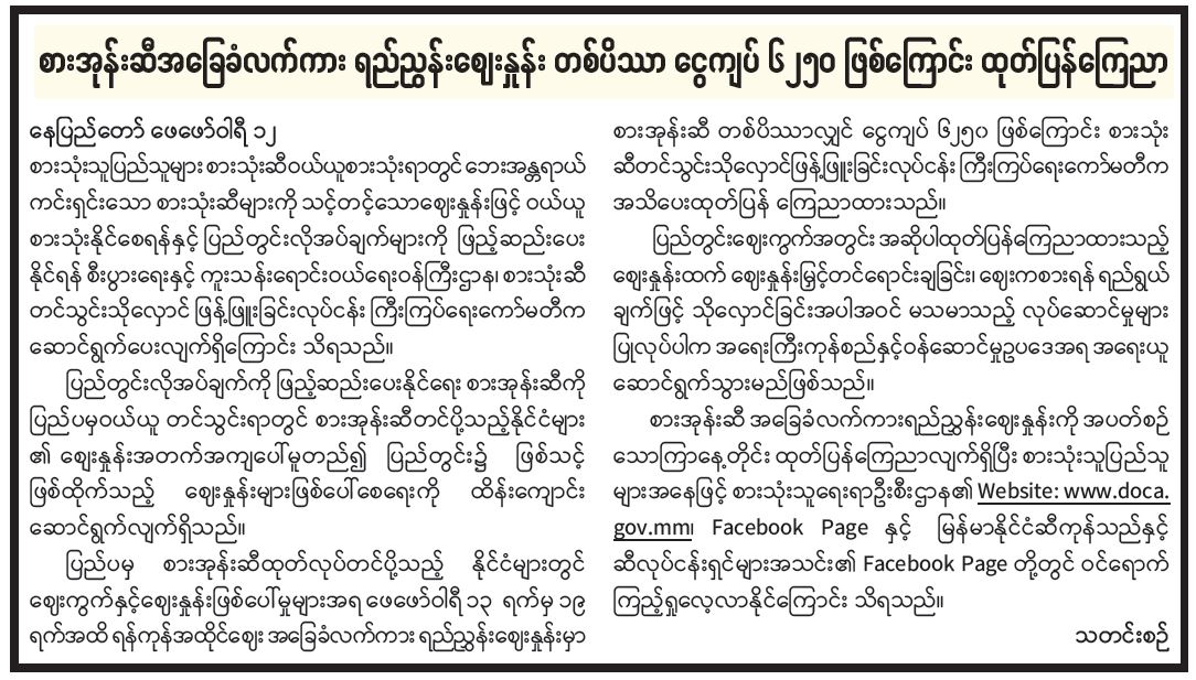 ရန်ကုန်မြို့နှင့် မန္တလေးမြို့အတွက် ရည်ညွှန်းလက်ကားဈေးနှုန်းများနှင့် ပြည်ထောင်စုနယ်မြေ နေပြည်တော်၊ တိုင်းဒေသကြီး/ပြည်နယ် မြို့တော်များအတွက် ရည်ညွှန်းလက်လီဈေးနှုန်းများ