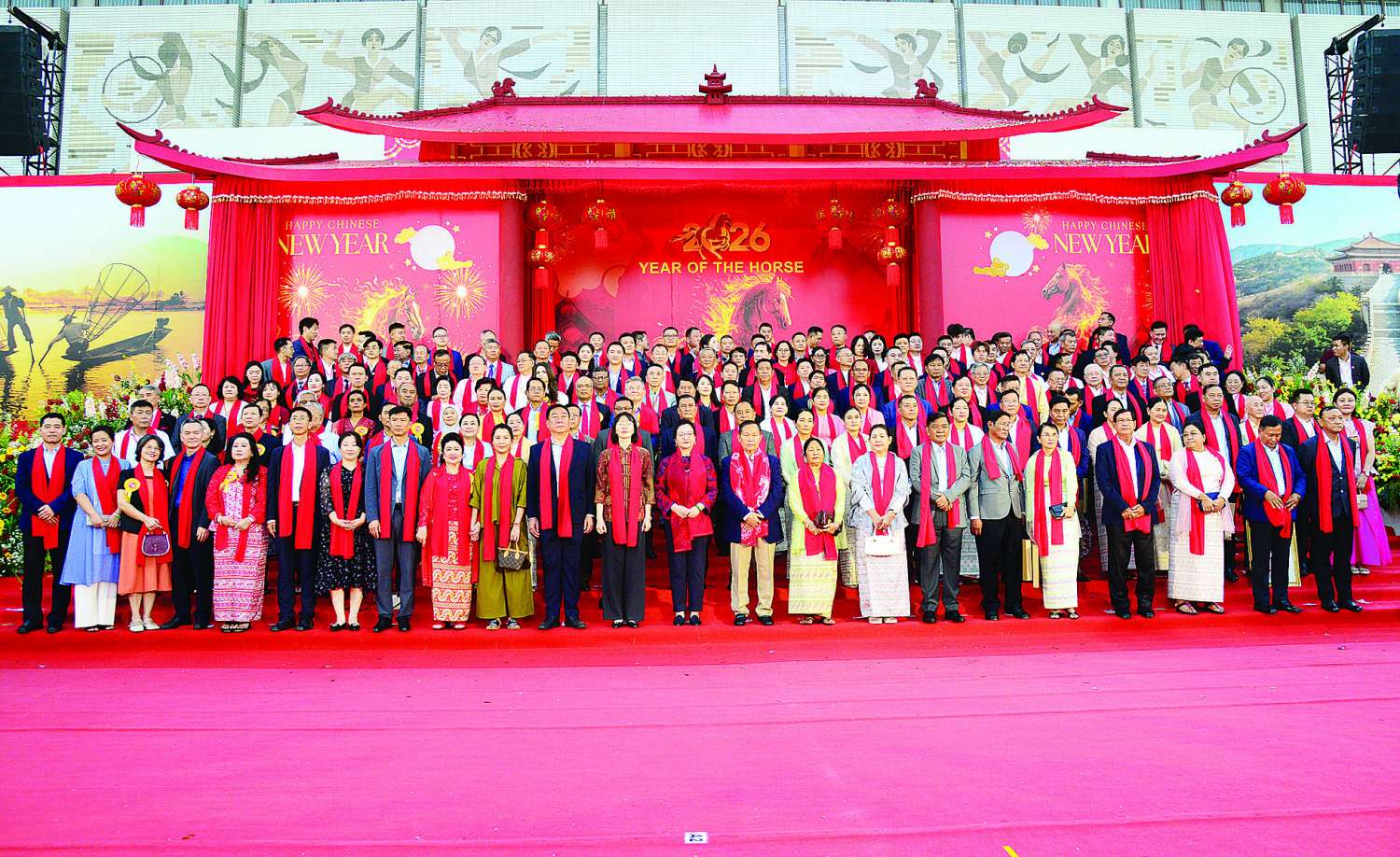 ယင်းနောက် ပြည်ထောင်စုဝန်ကြီးများဖြစ်ကြသည့် ဗိုလ်ချုပ်ကြီး မောင်မောင်အေး၊ ဦးဉာဏ်ထွန်း၊ ရန်ကုန်တိုင်းဒေသကြီး ဝန်ကြီးချုပ် ဦးစိုးသိန်း၊ ကာကွယ်ရေးဦးစီးချုပ်ရုံး (ကြည်း) မှ ဒုတိယဗိုလ်ချုပ်ကြီး ကိုကိုဦး၊ ဒုတိယဝန်ကြီးများ၊ မြန်မာနိုင်ငံဆိုင်ရာ တရုတ်သံရုံးမှ သံမှူးကြီးများ၊ မြန်မာနိုင်ငံကုန်သည်များနှင့်စက်မှုလက်မှုလုပ်ငန်းရှင်များအသင်းချုပ် (UMFCCI) ဒုတိယဥက္ကဋ္ဌ၊ မြန်မာ-တရုတ်ချစ်ကြည်ရေးဥက္ကဋ္ဌ၊ မြန်မာနိုင်ငံ တရုတ်ကုန်သည်များအသင်းချုပ်ဥက္ကဋ္ဌ၊ မြန်မာ - တရုတ် ဗုဒ္ဓဘာသာနှင့် ယဉ်ကျေးမှုနှီးနှောဖလှယ်ရေးအဖွဲ့နာယကနှင့် အသင်းအဖွဲ့များမှ တာဝန်ရှိသူများက (၂၀၂၆) ခုနှစ်၊ မြင်းနှစ် တရုတ်နှစ်သစ်ကူးပွဲတော် ဖွင့်ပွဲအခမ်းအနားအား ဖဲကြိုးဖြတ်ဖွင့်လှစ်ပေးသည်။