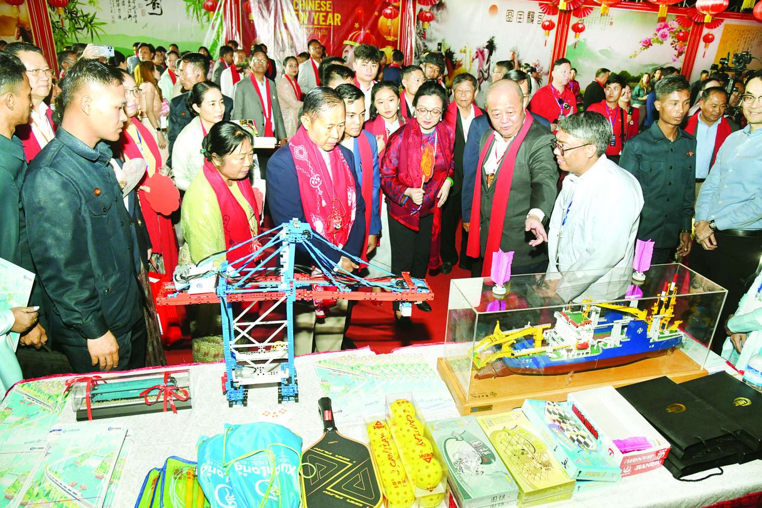ဆက်လက်၍ နိုင်ငံတော်လုံခြုံရေးနှင့်အေးချမ်းသာယာရေးကော်မရှင် ဒုတိယဥက္ကဋ္ဌနှင့် ဇနီး၊ တက်ရောက်လာကြသူများသည် ခြင်္သေ့ထိုင်အက၊ တရုတ်ရိုးရာ ကြက်တောင်ရိုက်ခြင်းနှင့် မြန်မာ့ရိုးရာတစ်ပင်တိုင် ခြင်းလုံးခတ်သရုပ်ပြဖျော်ဖြေမှုများကို ကြည့်ရှုအားပေးပြီး နှစ်သစ်ကူးလက်ဆောင်များ ပေးအပ်ကြသည်။