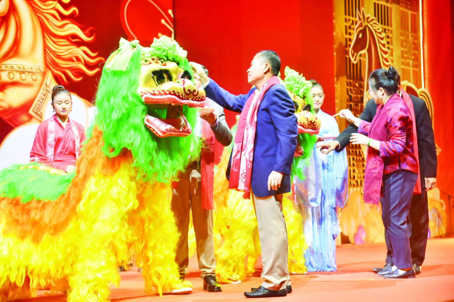 ယင်းနောက် မြင်းနှစ်တရုတ်နှစ်သစ်ကူးပွဲတော် ညစာစားပွဲအခမ်းအနားကို ဆက်လက်ကျင်းပပြုလုပ်ရာ ဦးစွာ တရုတ်ရိုးရာ ခြင်္သေ့အရုပ်အား ဆေးခြယ်အသက်သွင်းခြင်း မင်္ဂလာအခမ်းအနားကို ပြုလုပ်ခဲ့ပြီး နိုင်ငံတော်လုံခြုံရေးနှင့်အေးချမ်းသာယာရေးကော်မရှင် ဒုတိယဥက္ကဋ္ဌနှင့် ဇနီး၊ မြန်မာနိုင်ငံဆိုင်ရာ တရုတ်ပြည်သူ့သမ္မတနိုင်ငံ သံအမတ်ကြီးတို့က တရုတ်ရိုးရာခြင်္သေ့ အရုပ်အား တရုတ်ထုံးတမ်းစဉ်လာများနှင့်အညီ ဂုဏ်ပြုဆေးခြယ်သပေးသည်။ ယင်းနောက် တရုတ် ရိုးရာခြင်္သေ့အကအဖွဲ့က ဂါရဝပြုကပြကြရာ နှစ်သစ်ကူးလက်ဆောင်များ ပြန်လည်ပေးအပ်ခဲ့သည်။