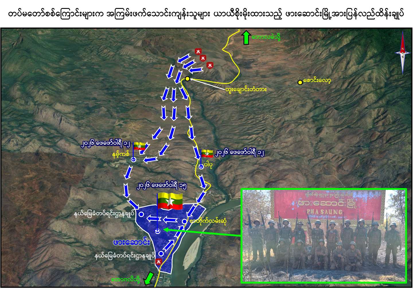 တပ်မတော်စစ်ကြောင်းများအနေဖြင့် KNPP ၊ KNDF အဖွဲ့များနှင့် PDF အမည်ခံအကြမ်းဖက်သောင်းကျန်းသူများ ယာယီစိုးမိုးထားသည့် ဖားဆောင်းမြို့နှင့် ၎င်းဒေသတစ်ဝိုက်အား ပြန်လည်ထိန်းချုပ်နိုင်ရေး လိုအပ်သည့် ပြင်ဆင်စုဖွဲ့မှုများဆောင်ရွက်ပြီး ၂၀၂၅ ခုနှစ်၊ စက်တင်ဘာ ၃၀ ရက်မှစ၍ ဘောလခဲ-ထူးချောင်း-ဖားဆောင်း ဆက်သွယ်ရေးလမ်းကြောင်း၏ အနောက်ဘက်ခြမ်းမှစတင်ပြီး အဆင့်ဆင့်ခြေကုပ်ယူ၍ နယ်မြေရှင်းလင်းခြင်းများဆောင်ရွက်ခဲ့ရာ အကြမ်းဖက်သောင်းကျန်းသူများ မိုင်းထောင်ဖောက်ခွဲဖျက်ဆီးခဲ့သည့် ထူးချောင်းတံတားနေရာတစ်ဝိုက်အား နိုဝင်ဘာ ၂၇ ရက်တွင် ဦးစွာထိန်းချုပ်နိုင်ခဲ့ပြီး ဆက်လက်၍ နယ်မြေရှင်းလင်းရေးလုပ်ငန်းများကို စစ်နည်းဗျူဟာမြောက်စစ်ကြောင်းများခွဲ၍ တစ်ဆင့်ပြီးတစ်ဆင့် တိုက်ခိုက်ချေမှုန်းခဲ့ရာ ၂၀၂၆ ခုနှစ်၊ ဖေဖော်ဝါရီလ ၁၂ ရက်တွင် အကြမ်းဖက်သောင်းကျန်းသူများ၏ အမာခံကျေးရွာကြီးများဖြစ်သည့် နမ့်ကစ်ကျေးရွာနှင့် ပါပုကျေးရွာတို့အား ခက်ခက်ခဲခဲတိုက်ခိုက်သိမ်းပိုက်ထိန်းချုပ်နိုင်ခဲ့ပြီးမှ ဖားဆောင်းမြို့သို့ ဆက်လက်ရှင်းလင်းချီတက်ခဲ့ရာ ၂၀၂၆ ခုနှစ်၊ ဖေဖော်ဝါရီ ၁၅ ရက် ယနေ့တွင် ဖားဆောင်းမြို့အား တပ်မတော်စစ်ကြောင်းများက အပြီးတိုင် ပြန်လည်သိမ်းပိုက်ထိန်းချုပ်နိုင်ခဲ့သည်။