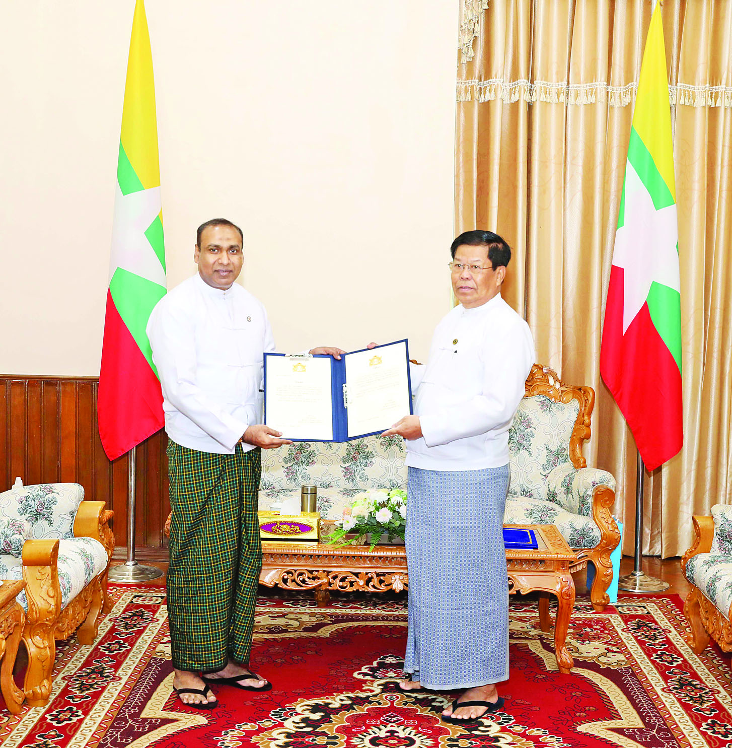 ပြည်ထောင်စုသမ္မတမြန်မာနိုင်ငံတော် နိုင်ငံခြားရေးဝန်ကြီးဌာန ပြည်ထောင်စုဝန်ကြီး ဦးသန်းဆွေသည် ပြည်ထောင်စုသမ္မတ မြန်မာနိုင်ငံတော်ဆိုင်ရာ အိုက်စလန်နိုင်ငံ ဂုဏ်ထူးဆောင်ကောင်စစ်ဝန် အဖြစ်ခန့်အပ်ရန် သဘောတူညီပြီးဖြစ်သော ဦးကိုကိုလတ်၏ ခန့်အပ်လွှာကို ယနေ့နံနက် ၁၁ နာရီခွဲတွင် နေပြည်တော်ရှိ နိုင်ငံခြားရေးဝန်ကြီးဌာန ပြည်ထောင်စုဝန်ကြီး၏ ဧည့်ခန်းမ၌လက်ခံ၍ ၎င်းအား အသိအမှတ်ပြုစာချွန်လွှာ ပြန်လည်ပေးအပ်သည်။