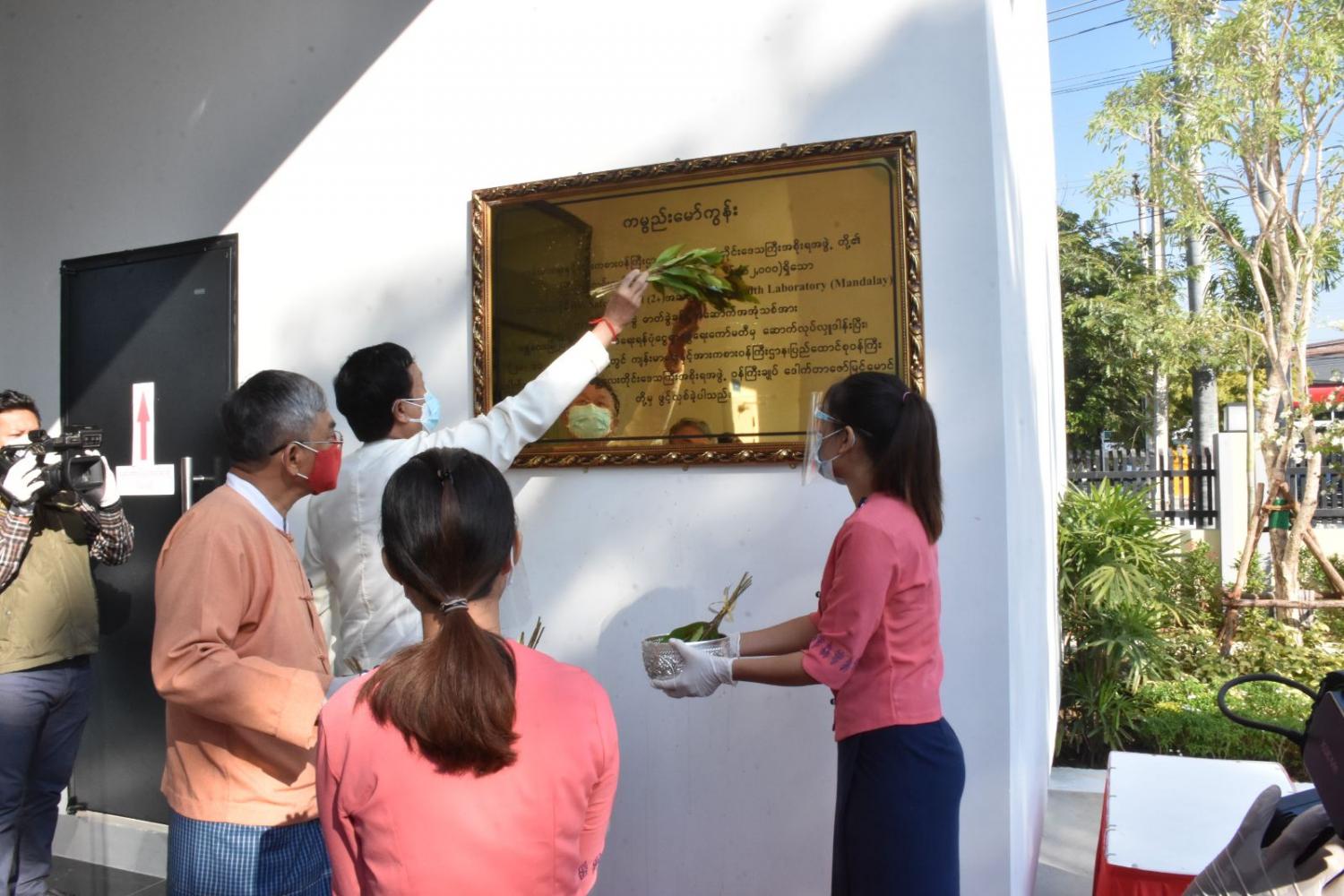 ဆက်လက်၍ မန္တလေးတိုင်းဒေသကြီး ဝန်ကြီးချုပ်ဒေါက်တာဇော်မြင့်မောင်နှင့် မန္တလေးမြို့ပြ ဖွံ့ဖြိုးတိုးတက်ရေး ရန်ပုံငွေရှာဖွေရေးကော်မတီဥက္ကဋ္ဌ ဦးကျော်ကျော်ဝင်းတို့က နိုင်ငံတကာ အဆင့်မီ Bio Safety Level - 2 အဆင့် Public Health Laboratory (Mandalay) အဆောက်အအုံသစ်ကို စက်ခလုတ်နှိပ်ဖွင့်လှစ်ပေးခဲ့ပြီး ဝန်ကြီးချုပ်နှင့် တာဝန်ရှိသူများက ကမ္ဗည်းမော်ကွန်းအား အမွေးနံ့သာများဖြင့် ပက်ဖြန်းခဲ့ကြသည်။