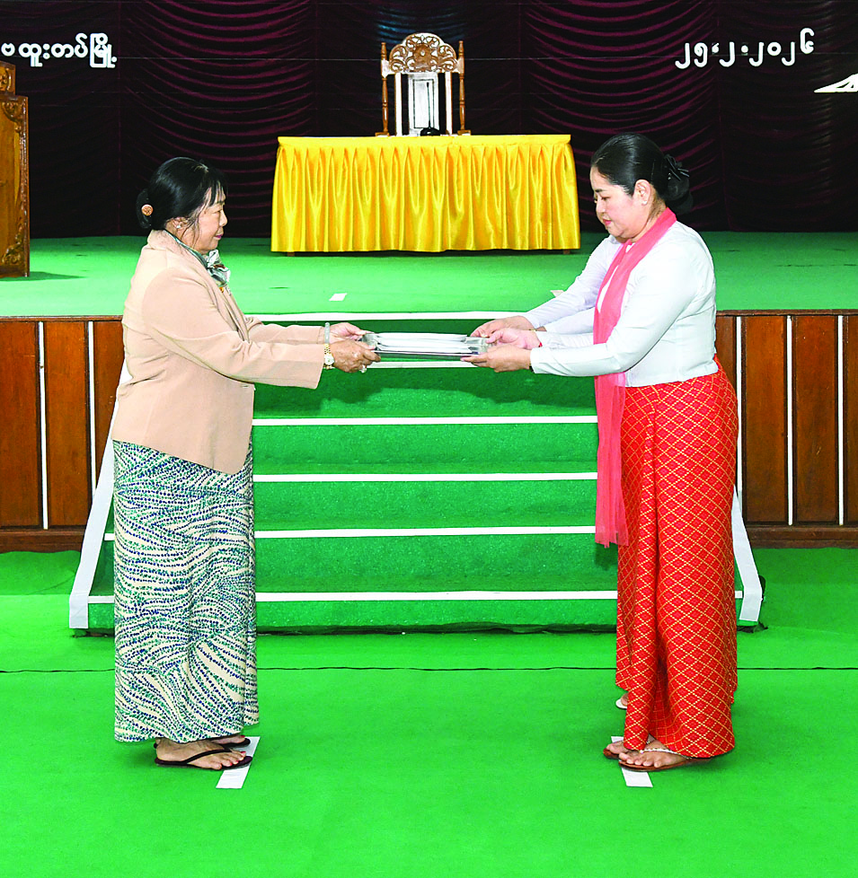 အလားတူ နိုင်ငံတော်လုံခြုံရေးနှင့်အေးချမ်းသာရေးကော်မရှင် ဒုတိယဥက္ကဋ္ဌ ဒုတိယတပ်မတော်ကာကွယ်ရေးဦးစီးချုပ်(ကြည်း)၏ ဇနီးက တပ်နယ်ရှိ မိခင်နှင့်ကလေးစောင့်ရှောက်ရေးအသင်းအတွက် ထောက်ပံ့ငွေများကို ပေးအပ်ရာ တာဝန်ရှိသူများက လက်ခံရယူသည်။