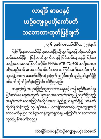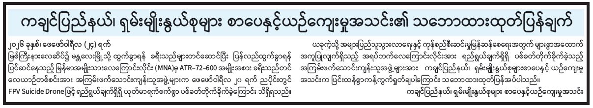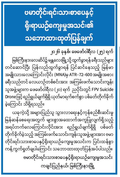 မြစ်ကြီးနားလေဆိပ်မှ ခရီးသည်တင်လေယာဉ်အား KIA အဖွဲ့နှင့် PDF အမည်ခံ အကြမ်းဖက်သောင်းကျန်းသူ ပူးပေါင်းအဖွဲ့များက ယုတ်မာပက်စက်စွာ FPV suicide drone များဖြင့် ပစ်ခတ်တိုက်ခိုက်ခဲ့မှုအပေါ် ပြင်းထန်စွာ ကန့်ကွက်ရှုတ်ချကြောင်း သဘောထားထုတ်ပြန်ချက်များ ထပ်မံထုတ်ပြန်