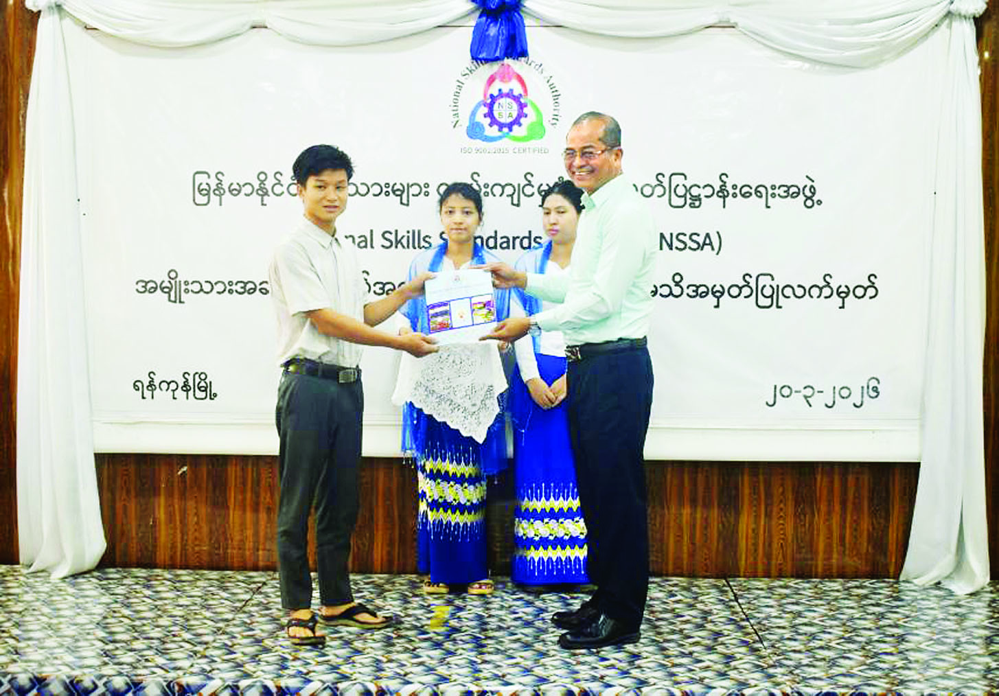 မြန်မာနိုင်ငံလုပ်သားများ ကျွမ်းကျင်မှုစံသတ်မှတ် ပြဋ္ဌာန်းရေးအဖွဲ့(NSSA) ၏ အမျိုးသားအဆင့် အလုပ်အကိုင်ဆိုင်ရာ ကျွမ်းကျင်မှုအသိအမှတ်ပြုလက်မှတ်ပေးအပ်ပွဲကို ယနေ့နံနက်ပိုင်းတွင် ရန်ကင်းမြို့နယ်ရှိ ကျွမ်းကျင်မှုလေ့ကျင့်ရေး သင်တန်းကျောင်း၌ကျင်းပရာ အလုပ်သမားဝန်ကြီးဌာန ဒုတိယဝန်ကြီး ဦးဝင်းရှိန်နှင့် သက်ဆိုင်ရာတာဝန်ရှိသူများ တက်ရောက်ကြသည်။
