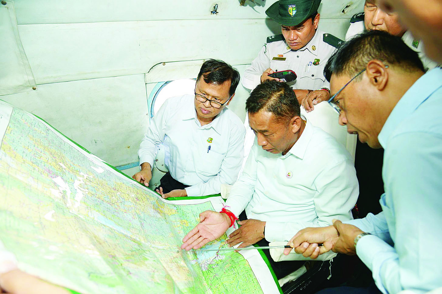 ဟဲဟိုးလေဆိပ်၌ ရှမ်းပြည်နယ် သယံဇာတရေးရာဝန်ကြီး ဦးစိုင်းလိတ်၊ အထွေထွေအုပ်ချုပ်ရေးဦးစီးဌာနမှ တာဝန်ရှိသူများ၊ ပြည်နယ်ပတ်ဝန်းကျင်ထိန်းသိမ်းရေးဦးစီးဌာန ညွှန်ကြားရေးမှူးနှင့် ရှမ်းပြည်နယ်သစ်တောဦးစီးဌာနမှ တာဝန်ရှိသူများက ညောင်ရွှေမြို့နယ် အင်းလေးကန်တစ်ဝိုက်အား ဝေဟင်မှလှည့်လည်ကြည့်ရှုစစ်ဆေးမည့် အချက်အလက်များနှင့် စပ်လျဉ်း၍ ရှင်းလင်းတင်ပြကြသည်။