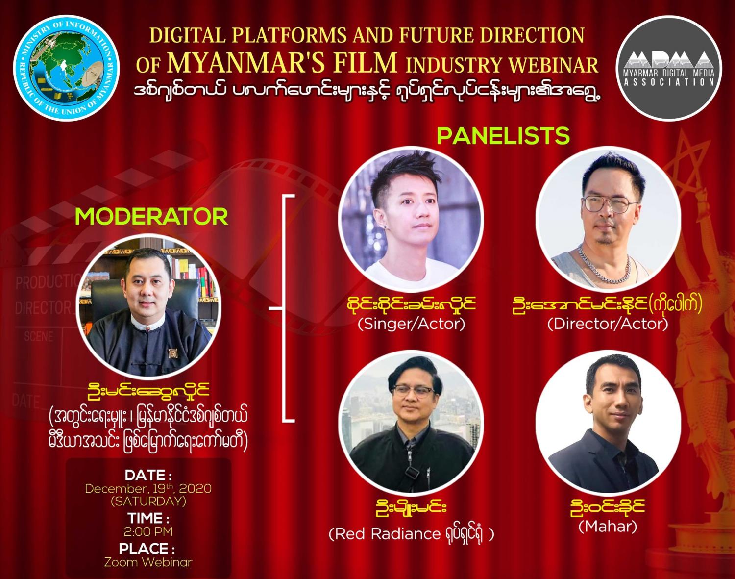 ပြန်ကြားရေးဝန်ကြီးဌာနနှင့် မြန်မာနိုင်ငံ ဒီဂျစ်တယ် မီဒီယာအသင်း ဖြစ်မြောက်ရေး ကော်မတီ တို့ ပူးပေါင်း ကျင်းပမည့် “ဒီဂျစ်တယ်ပလက်ဖောင်းများနှင့် မြန်မာ့ရုပ်ရှင် လုပ်ငန်းများ၏ အရွေ့” အွန်လိုင်းဆွေးနွေးပွဲကို ဒီဇင်ဘာလ ၁၉ ရက်နေ့ မွန်းလွဲ ၂ နာရီတွင် Zoom Webinar စနစ်ဖြင့် ကျင်းပပြုလုပ် သွားမည်ဖြစ်ကြောင်း သိရသည်။