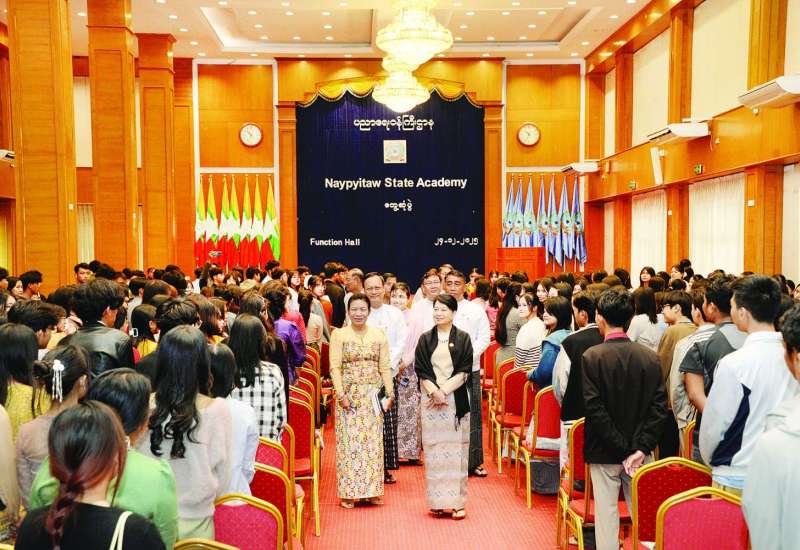 ပညာရေးဝန်ကြီးဌာန ပြည်ထောင်စုဝန်ကြီး ဒေါက်တာချောချောစိန်သည် ယနေ့နံနက်ပိုင်းတွင် Naypyitaw State Academy သို့ရောက်ရှိပြီး ပါမောက္ခချုပ်၊ ဒုတိယပါမောက္ခချုပ်၊ ပါမောက္ခ (ဌာနမှူး) များ၊ ဆရာ ဆရာမများ၊ ဝန်ထမ်းများ၊ ကျောင်းသား ကျောင်းသူများနှင့် တွေ့ဆုံသည်။