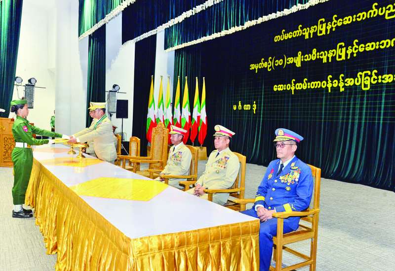 ပြည်သူများအား နှိပ်စက်ညှဉ်းပန်း၍ ဒေသဖွံ့ဖြိုးတိုးတက်မှုကို ချွတ်ခြုံကျစေသည့် အကြမ်းဖက်လုပ်ရပ်များကို လုပ်ဆောင်ခဲ့သော ကျောက်မဲမြို့ ဒေသတစ်ဝိုက်ရှိ လက်နက်ကိုင်အကြမ်းဖက်အဖွဲ့များနှင့် PDF အမည်ခံအကြမ်းဖက်အဖွဲ့များအား ရွပ်ရွပ်ချွံချွံတိုက်ပွဲဝင်၍ အဆိုပါမြို့နှင့် ဒေသတစ်ဝိုက်အား ဒေသခံပြည်သူများ၏ လက်ဝယ်သို့ ပြန်လည်အပ်နှင်းနိုင်ခဲ့သည့် အောင်ပွဲအလီလီရ ရှေ့တန်းပြန်နိုင်ငံ့ သားကောင်းတပ်မတော်သားများအား ဂုဏ်ပြုကြိုဆိုခြင်းကို ယနေ့နံနက်ပိုင်းတွင် ရှမ်းပြည်နယ် (မြောက်ပိုင်း) သီပေါမြို့နယ် နမ့်လန်ကျေးရွာအုပ်စုရှိ နယ်မြေခံတပ်ရင်း၌ ကျင်းပပြုလုပ်ရာ အရှေ့မြောက်တိုင်းစစ်ဌာနချုပ် တိုင်းမှူး ဗိုလ်မှူးချုပ် အေးမင်းဦးနှင့် တာဝန်ရှိသူများ၊ ဌာနဆိုင်ရာတာဝန်ရှိသူများ၊ တပ်မတော်သားများ၊ မိသားစုဝင်များ၊ ဆရာ ဆရာမများ၊ ကျောင်းသား ကျောင်းသူများနှင့် ဒေသခံတိုင်းရင်းသားပြည်သူများက ဝမ်းမြောက်စွာ သောင်းသောင်းဖြဖြ ကြိုဆိုဂုဏ်ပြုကြသည်။