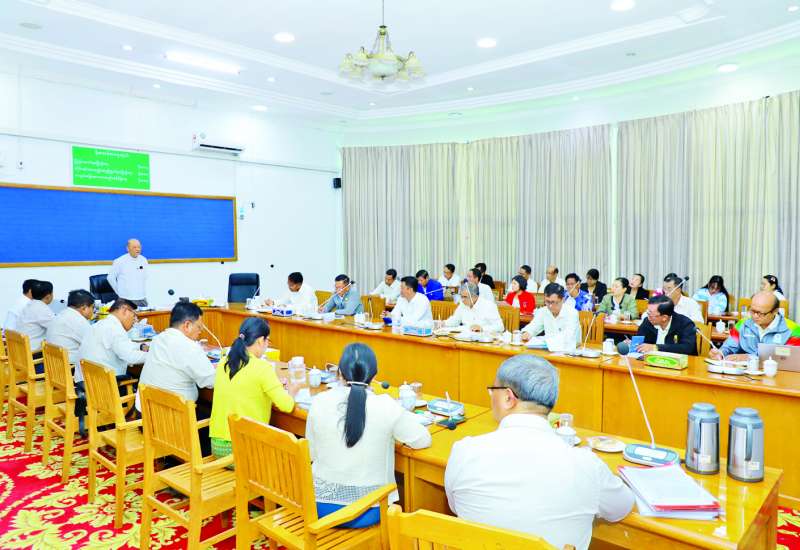 ပြန်ကြားရေးဝန်ကြီးဌာန ပုံနှိပ်ရေးနှင့်ထုတ်ဝေရေးဦးစီးဌာန စာဆိုဗိမာန် RC သုံးထပ်အဆောက်အအုံတည်ဆောက်နေမှုနှင့် စာပေဗိမာန်ပြည်သူ့စာကြည့်တိုက်အဖြစ် ပြောင်းရွှေ့ဖွင့်လှစ်ရန် ဆောင်ရွက်နေမှုအခြေအနေများ ရှင်းလင်းတင်ပြခြင်းကို ယနေ့မွန်းလွဲပိုင်းက နေပြည်တော်ရှိ ပြန်ကြားရေးဝန်ကြီးဌာန အစည်းအဝေးခန်းမ၌ ပြုလုပ်သည်။