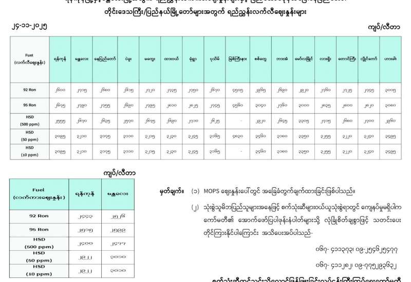 ရန်ကုန်မြို့နှင့် မန္တလေးမြို့အတွက် ရည်ညွှန်းလက်ကားဈေးနှုန်းများနှင့် ပြည်ထောင်စုနယ်မြေ နေပြည်တော်၊ တိုင်းဒေသကြီး/ ပြည်နယ်မြို့တော်များအတွက် ရည်ညွှန်းလက်လီဈေးနှုန်းများ