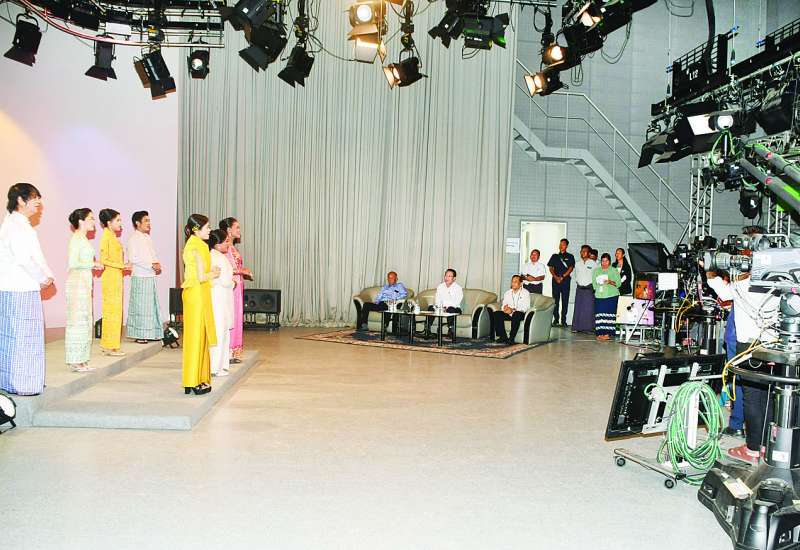 ပြန်ကြားရေးဝန်ကြီးဌာန ပြည်ထောင်စုဝန်ကြီး ဦးမောင်မောင်အုန်းသည် ယနေ့ညနေပိုင်းတွင် ရန်ကုန်မြို့ ပြည်လမ်းရှိ မြန်မာ့အသံနှင့်ရုပ်မြင်သံကြား၌ ၂၀၂၅ ခုနှစ် ပါတီစုံဒီမိုကရေစီအထွေထွေ ရွေးကောက်ပွဲကြီး အောင်မြင်စွာကျင်းပနိုင်ရန်အတွက် တိုင်းရင်းသားပြည်သူလူထုတစ်ရပ်လုံးက ဝိုင်းဝန်းကြိုးပမ်းဆောင်ရွက်နေမှုတွင် မြန်မာနိုင်ငံဂီတအစည်းအရုံး (ဗဟို) အစီအစဉ်ဖြင့် အသိပညာပေးနှိုးဆော်ရေး ရွေးကောက်ပွဲလှုံ့ဆော်တေး ရိုက်ကူးနေမှုကို ကြည့်ရှုအားပေးသည်။
