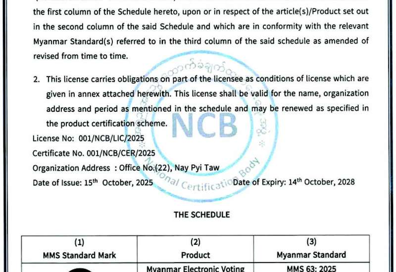 ၂၀၂၅ ခုနှစ်၊ ပါတီစုံဒီမိုကရေစီအထွေထွေရွေးကောက်ပွဲတွင် အသုံးပြုမည့် မြန်မာအီလက်ထရောနစ်မဲပေးစက်(MEVM)များကို ပြည်တွင်းနည်းပညာရှင်များက ပထမဆုံးတီထွင်ထုတ်လုပ်ထားခြင်းဖြစ်သဖြင့် စက်၏အရည်အသွေးနှင့် စံချိန်စံညွှန်းကို စစ်ဆေးပေးနိုင်ရေးတင်ပြခဲ့ရာ အမျိုးသားစံချိန်စံညွှန်းကောင်စီက မြန်မာအီလက်ထရောနစ်မဲပေးစနစ်ဆိုင်ရာ စံချိန်စံညွှန်းရေးဆွဲရေးနည်းပညာဆပ်ကော်မတီကို သက်ဆိုင်ရာကဏ္ဍအလိုက် ပညာရှင်များပါဝင်သည့် အဖွဲ့ဝင် ၂၀ ဦးဖြင့် ဖွဲ့စည်းခဲ့ပါသည်။ အဆိုပါနည်းပညာဆပ်ကော်မတီအနေဖြင့် မြန်မာအီလက်ထရောနစ်မဲပေးစက်ဆိုင်ရာစံချိန်စံညွှန်း (မူကြမ်း)ကို ရေးဆွဲတင်ပြခဲ့သဖြင့် အမျိုးသားစံချိန်စံညွှန်းကောင်စီအနေဖြင့် စံချိန်စံညွှန်းသတ်မှတ်ခြင်းဆိုင်ရာ ဥပဒေပုဒ်မ ၃၃ ပုဒ်မခွဲ (ခ) အရ အပ်နှင်းထားသော လုပ်ပိုင်ခွင့်ကို ကျင့်သုံး၍ ပုဒ်မ ၅ ပုဒ်မခွဲ (ခ)ပါ လုပ်ငန်းတာဝန်အရ ၂ - ၉ - ၂၀၂၅ ရက်စွဲပါ အမိန့်ကြော်ငြာစာအမှတ်၊ ၀၇၅/၂၀၂၅ ဖြင့် မြန်မာအီလက်ထရောနစ်မဲပေးစက်ဆိုင်ရာ စံချိန်စံညွှန်းကို မြန်မာစံချိန်စံညွှန်းအဖြစ် သတ်မှတ်ခဲ့ပါသည်။