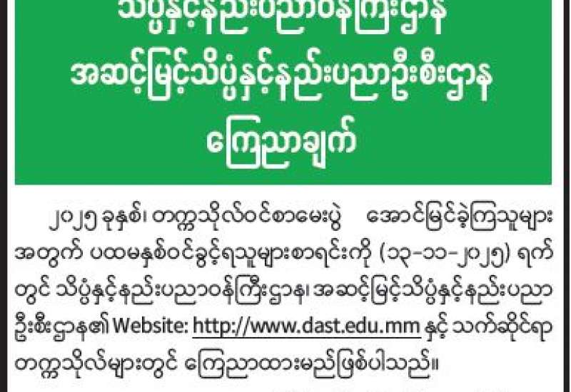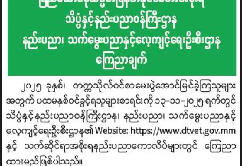 ပြည်ထောင်စုသမ္မတမြန်မာနိုင်ငံတော်အစိုးရ သိပ္ပံနှင့်နည်းပညာဝန်ကြီးဌာန နည်းပညာ၊ သက်မွေးပညာနှင့်လေ့ကျင့်ရေးဦးစီးဌာန ကြေညာချက်