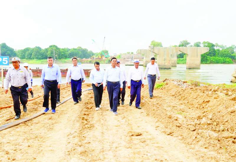 အဆောက်အအုံများ ပြန်လည်ပြုပြင်အသုံးပြုရေးနှင့် အသစ်တည်ဆောက်ရေး ကြီးကြပ်မှုကော်မတီဥက္ကဋ္ဌ ဆောက်လုပ်ရေးဝန်ကြီးဌာန ပြည်ထောင်စုဝန်ကြီး ဦးမျိုးသန့်သည် တာဝန်ရှိသူများနှင့်အတူ ယနေ့တွင် ရန်ကုန်-မန္တလေး အမြန်လမ်း (မန္တလေး-နေပြည်တော်အပိုင်း) မိုင်တိုင် (၃၅၈/၁)တွင် ငလျင်ဒဏ်ကြောင့် ပျက်စီးသွားသော ဒုဋ္ဌဝတီတံတားအသစ် ပြန်လည်တည်ဆောက်နေမှုကို ကြည့်ရှုစစ်ဆေးသည်။