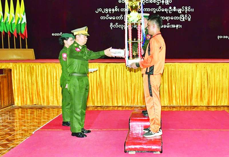 ၂၀၂၅ ခုနှစ်၊ တပ်မတော်ကာကွယ်ရေး ဦးစီးချုပ်ဒိုင်း၊ တပ်မတော်(ကြည်း၊ ရေ၊ လေ) ကရာတေးပြိုင်ပွဲ ဗိုလ်လုပွဲနှင့်ဆုချီးမြှင့်ပွဲကို ယနေ့ မွန်းလွဲပိုင်းတွင် တောင်ပိုင်းတိုင်းစစ်ဌာနချုပ် အေးချမ်းဖြိုးခန်းမ၌ ပြုလုပ်ရာ တပ်မတော်ကာကွယ်ရေးဦးစီးချုပ်ကိုယ်စား တောင်ပိုင်းတိုင်းစစ်ဌာနချုပ်တိုင်းမှူး ဗိုလ်ချုပ် ကြည်သိုက်၊ အရာရှိ၊ စစ်သည်၊ မိသားစုဝင်များ၊ ဒိုင်အဖွဲ့ဝင်များနှင့် ပြိုင်ပွဲဝင်အားကစားသမားများ တက်ရောက်ကြသည်။