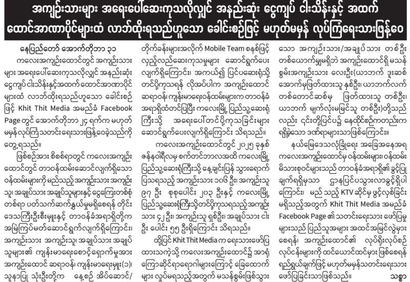 အကျဉ်းသားများအရေးပေါ်ဆေးကုသလိုလျှင် အနည်းဆုံးငွေကျပ် ငါးသိန်းနှင့်အထက် ထောင်အာဏာပိုင်များထံ လာဘ်ထိုးရသည်ဟူသော ခေါင်းစဉ်ဖြင့် မဟုတ်မမှန်လုပ်ကြံရေးသားဖြန့်ဝေ