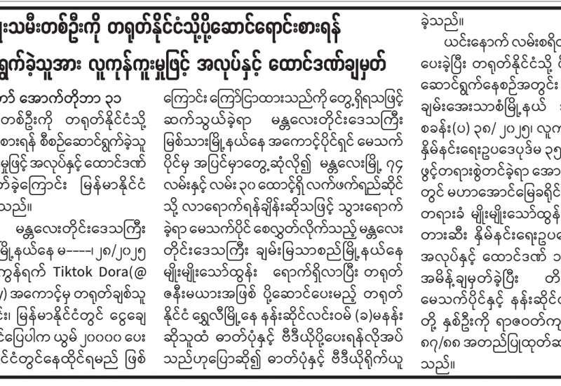 အမျိုးသမီးတစ်ဦးကို တရုတ်နိုင်ငံသို့ ပို့ဆောင်ရောင်းစားရန်စီစဉ်ဆောင်ရွက်ခဲ့သူအား လူကုန်ကူးမှုဖြင့် အလုပ်နှင့်ထောင်ဒဏ်ချမှတ်