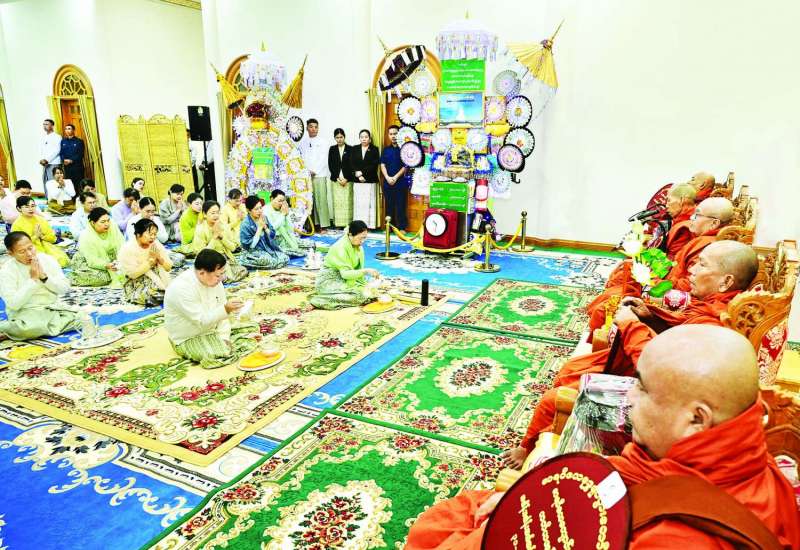 ပြည်ထောင်စုနယ်မြေနေပြည်တော် ဒက္ခိဏသီရိမြို့နယ် မာရဝိဇယဗုဒ္ဓဥယျာဉ်ဝတ္ထုကံတော်အတွင်းရှိ မာရဝိဇယကျောင်းတော် ၂၀၂၅ခုနှစ်ကထိန်သင်္ကန်းဆက်ကပ်လှူဒါန်းပွဲအခမ်းအနားကို ယနေ့နံနက်ပိုင်းတွင် အဆိုပါမာရဝိဇယကျောင်းတော်၌ကျင်းပပြုလုပ်ရာ ပြည်ထောင်စုသမ္မတမြန်မာနိုင်ငံတော်ယာယီသမ္မတ နိုင်ငံတော်လုံခြုံရေးနှင့်အေးချမ်းသာယာရေးကော်မရှင်ဥက္ကဋ္ဌ ဗိုလ်ချုပ်မှူးကြီး မင်းအောင်လှိုင်နှင့်ဇနီး ဒေါ်ကြူကြူလှတို့ တက်ရောက်၍ ကထိန်လျာသင်္ကန်းနှင့်လှူဖွယ်ပစ္စည်းများ ဆက်ကပ်လှူဒါန်းသည်။