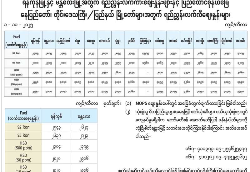 ရန်ကုန်မြို့နှင့် မန္တလေးမြို့အတွက် ရည်ညွှန်းလက်ကားဈေးနှုန်းများနှင့် ပြည်ထောင်စုနယ်မြေနေပြည်တော်၊ တိုင်းဒေသကြီး/ပြည်နယ် မြို့တော်များအတွက် ရည်ညွှန်းလက်လီဈေးနှုန်းများ
