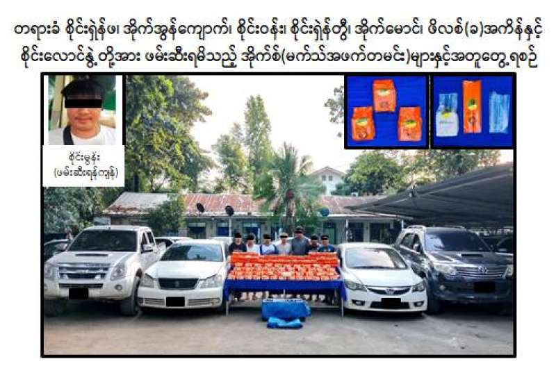 ရှမ်းပြည်နယ်(အရှေ့ပိုင်း)၊ တာချီလိတ်မြို့နယ်၊ ဖန်မင်ကျေးရွာအုပ်စု၊ မယ်ယန်းကျေးရွာ၌ အောက်တိုဘာ ၄ ရက်တွင်အိုက်စ် (မက်သ်အဖက်တမင်း) ၂၀၇ ကီလို (ခန့်မှန်းတန်ဖိုးငွေကျပ် ၁ ဒသမ ၆၅၆ ဘီလီယံခန့်) ဖမ်းဆီးရမိခဲ့ကြောင်း မြန်မာနိုင်ငံရဲတပ်ဖွဲ့မှသိရှိရသည်။