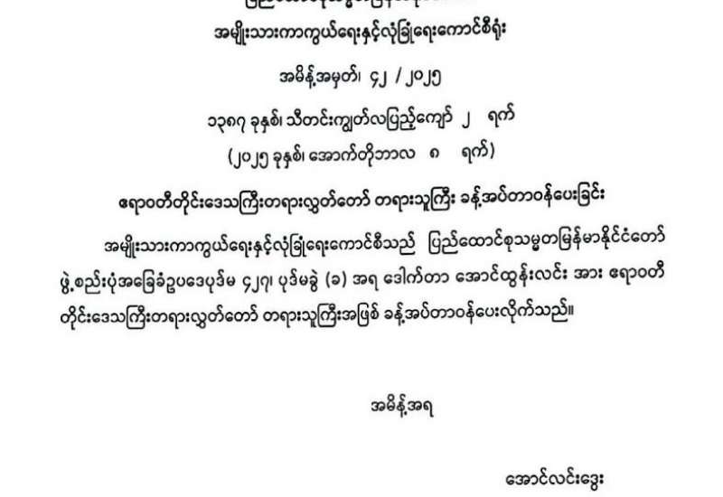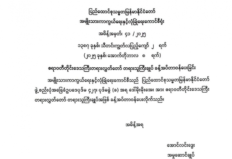 ရန်ကုန်မြို့နှင့် မန္တလေးမြို့အတွက် ရည်ညွှန်းလက်ကားဈေးနှုန်းများနှင့် ပြည်ထောင်စုနယ်မြေ နေပြည်တော်၊ တိုင်းဒေသကြီး/ပြည်နယ် မြို့တော်များအတွက် ရည်ညွှန်းလက်လီဈေးနှုန်းများ