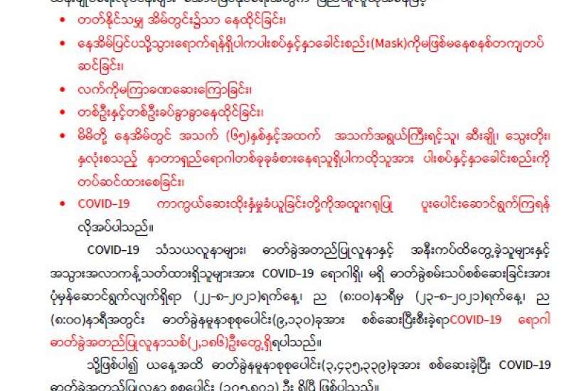 စီးပွားရေးနှင့် ကူးသန်းရောင်းဝယ်ရေးဝန်ကြီးဌာန အနေဖြင့် နိုင်ငံတော်အတွင်း၌ ကိုဗစ်-၁၉ ကာကွယ်၊ ထိန်းချုပ်၊ ကုသရေး လုပ်ငန်းများအတွက် လိုအပ်လျက်ရှိသည့် အောက်ဆီဂျင်၊ ဆေးဝါးနှင့် ဆက်စပ် ပစ္စည်းများ ပြတ်လပ်မှုမရှိစေပဲ အမြန်ဆုံးဝင်ရောက်နိုင်ရေးအတွက် လေကြောင်း၊ ရေကြောင်းနှင့် နယ်စပ်ကုန်သွယ်ရေးစခန်းများမှ တင်သွင်းခွင့်ပြုပေးလျက်ရှိရာ အများပြည်သူ အလုပ်ပိတ်ရက်အဖြစ် သတ်မှတ်ကြေညာထားသည့် ဩဂုတ် ၂၃ ရက်မှ ၃၁ ရက် အတွင်း၌လည်း အဆင်ပြေချောမွေ့စွာ တင်သွင်းနိုင်ရေးအတွက် သက်ဆိုင်ရာ ဌာနများမှ တာဝန်ရှိသူများနှင့် ညှိနှိုင်းထားသည့် SOP များနှင့်အညီ လွယ်ကူမြန်ဆန်နိုင်ရေးအတွက် ပူးပေါင်းဆောင်ရွက်ပေးလျက်ရှိသည်။
