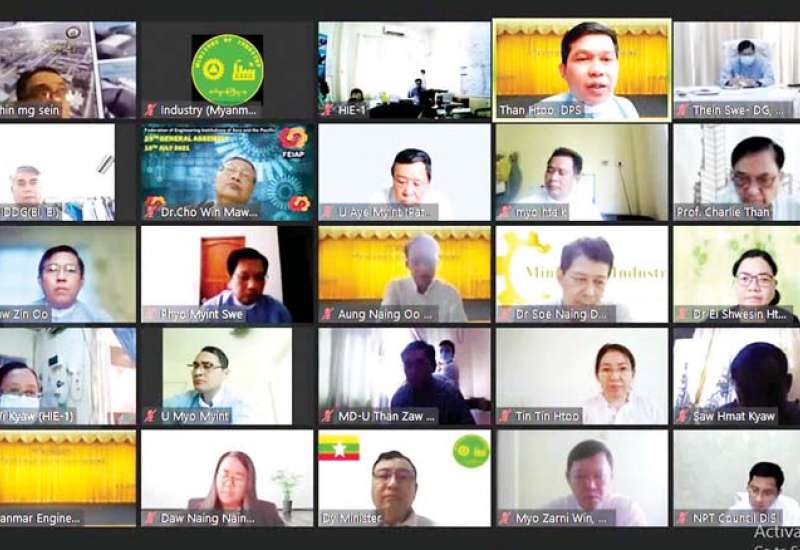 နေပြည်တော်ကောင်စီနယ်မြေ ဖွံ့ဖြိုးတိုးတက်ရေး ညှိနှိုင်းအစည်းအဝေးကို ယနေ့နံနက်ပိုင်းတွင် Video conferencing စနစ်ဖြင့် ကျင်းပပြုလုပ်ရာ စက်မှုဝန်ကြီးဌာန ပြည်ထောင်စုဝန်ကြီး ဒေါက်တာ ချာလီသန်း၊ ဒုတိယဝန်ကြီးနှင့် တာဝန်ရှိသူများ၊ မြန်မာနိုင်ငံ အင်ဂျင်နီယာကောင်စီမှ နာယက၊ ဥက္ကဋ္ဌနှင့် အဖွဲ့ဝင်များ တက်ရောက်ကြသည်။