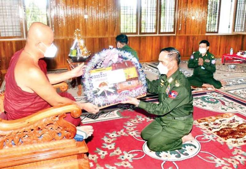 ဘုန်းတော်ကြီးကျောင်းများ၊ သာသနာ့နွယ်ဝင် သီလရှင်ကျောင်းများနှင့် ဘာသာရေးကျောင်းများတွင် ဆွမ်းဆန်တော်၊ ဆီ၊ ဆား၊ ပဲ အမယ်လေးမျိုးနှင့် လှူဖွယ်ပစ္စည်းများလှူဒါန်းခြင်း၊ နေ့ဆွမ်းများ ဆက်ကပ်လှူဒါန်းခြင်းနှင့် ကျန်းမာရေး စစ်ဆေးပေးခြင်းများကို ဆောင်ရွက်လျက်ရှိရာ ယနေ့တွင် မွန်ပြည်နယ်၊ သံဖြူဇရပ်မြို့၊ သာသနာ့ပါလမွန်ကျောင်းတိုက်သို့ ကာကွယ်ရေးဦးစီးချုပ်ရုံး(ကြည်း)မှ ဒုတိယ ဗိုလ်ချုပ်ကြီး အောင်စိုး၊ အရှေ့တောင်တိုင်းစစ်ဌာနချုပ် တိုင်းမျူး ဗိုလ်ချုပ် ကိုကိုမောင်နှင့် အဖွဲ့ဝင်များက သွားရောက်၌ သံဃာတော်များအား ဆွမ်းဆန်တော်၊ ဆန်၊ ဆီ၊ လှူဖွယ်ပစ္စည်းများနှင့် ကိုဗစ်-၁၉ ရောဂါကြိုတင်ကာကွယ်ရေး အထောက်အကူပြု ဆေးဝါးများကို ဆက်ကပ်လှူဒါန်း ကြသည်။